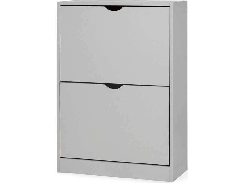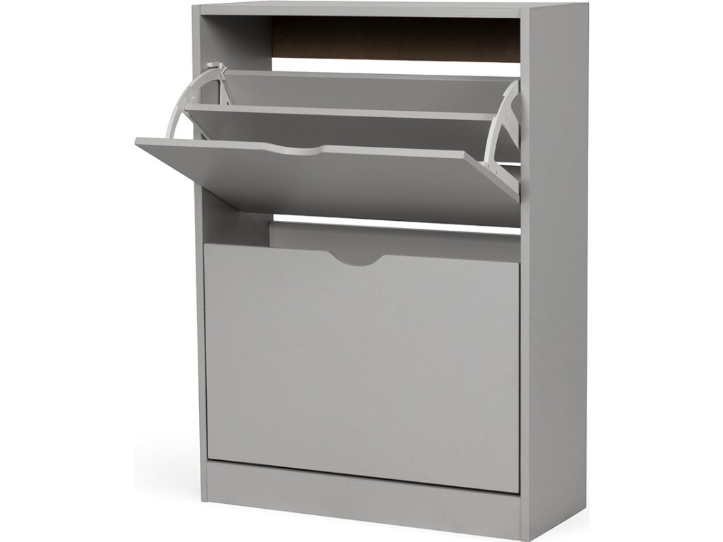 Botník z laminované překližky v šedé barvě, dvě výklopné přihrádky, bez zadní desky.