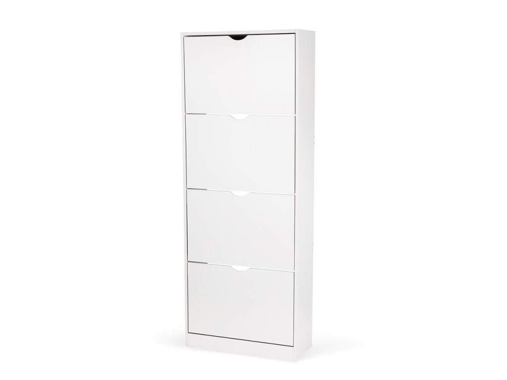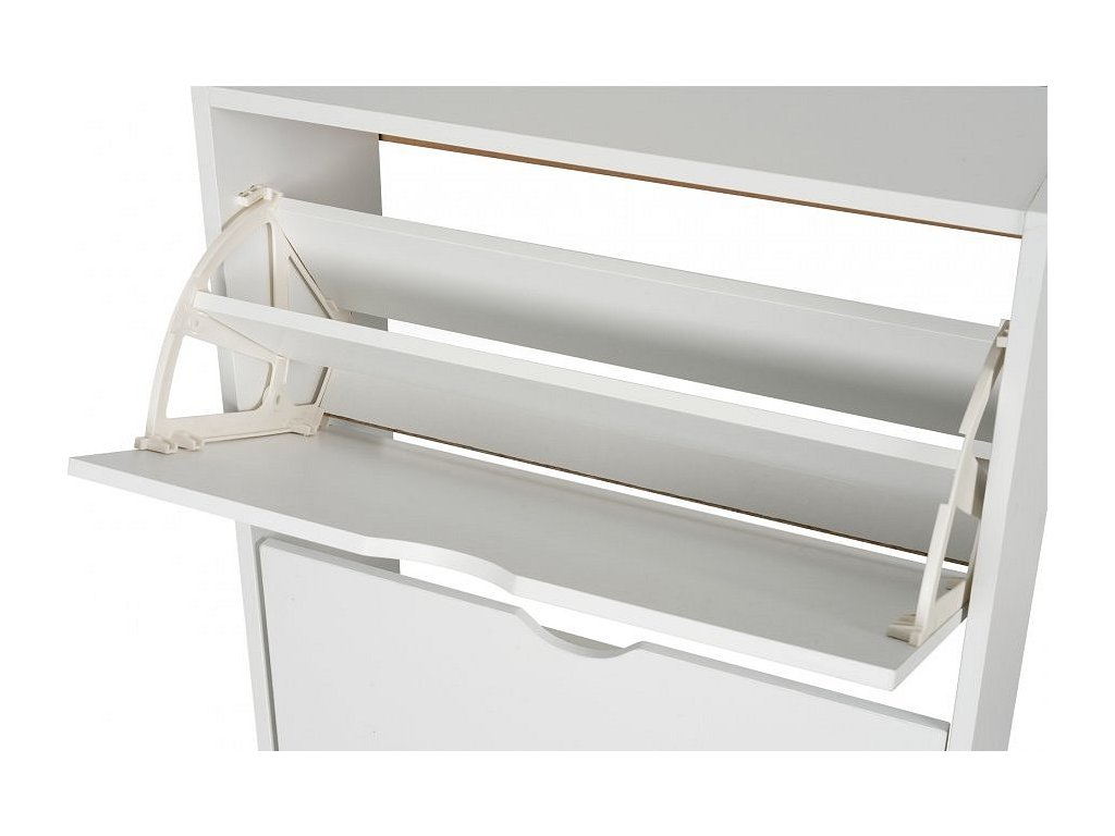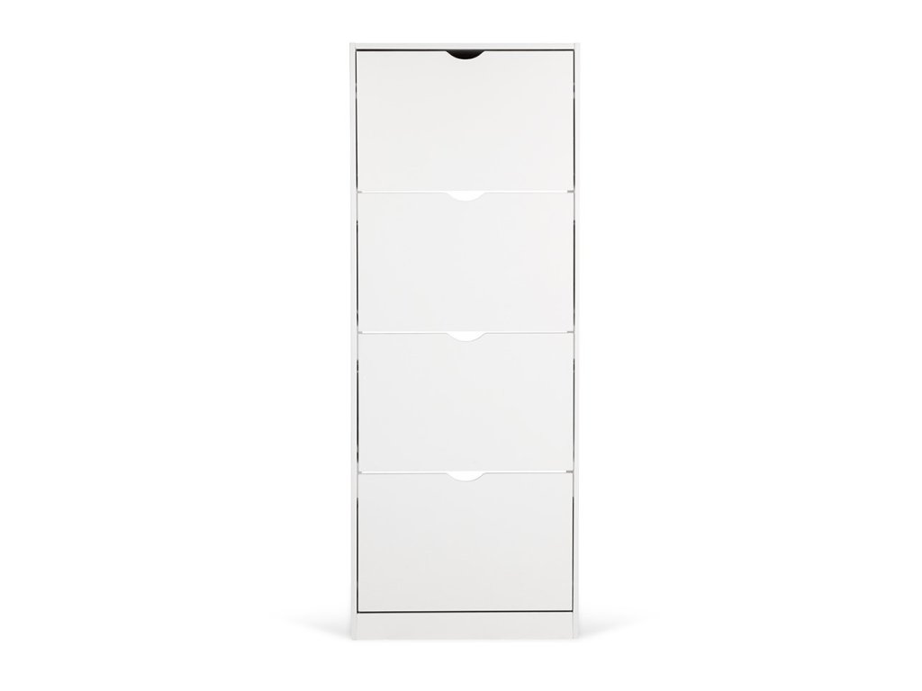 Botník z laminované dřevotřísky v bílé barvě, čtyři výklopné přihrádky, bez zadní desky.