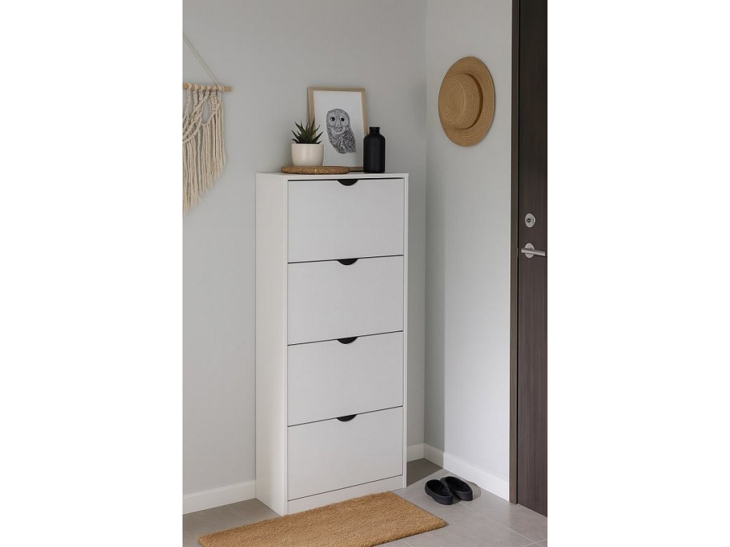 Botník s kompaktním a úzkým designem, ideální do menších prostor. Čtyři výklopné úložné prostory pro obuv. Jednoduché otevírání pomocí výřezů místo úchytek. Stabilní konstrukce pro každodenní používání. Moderní a minimalistický vzhled vhodný do předsíně či chodby.