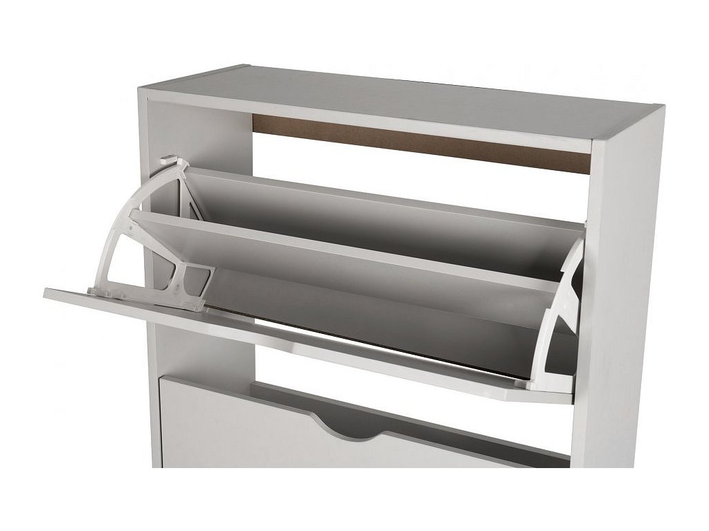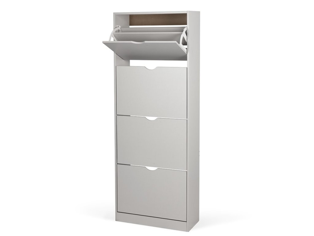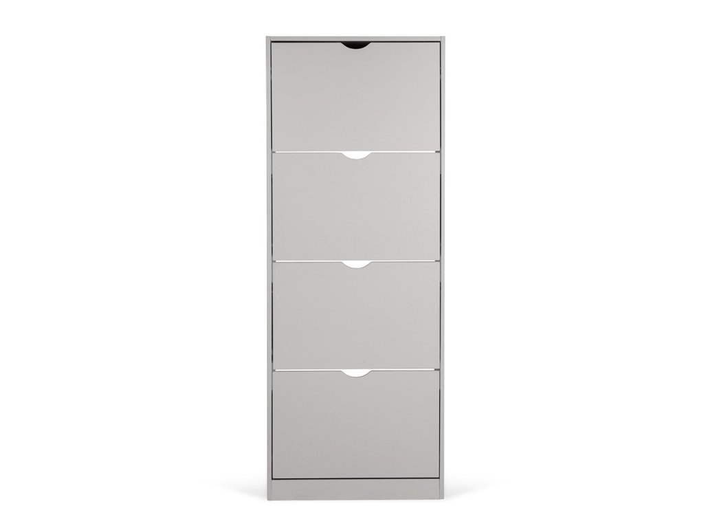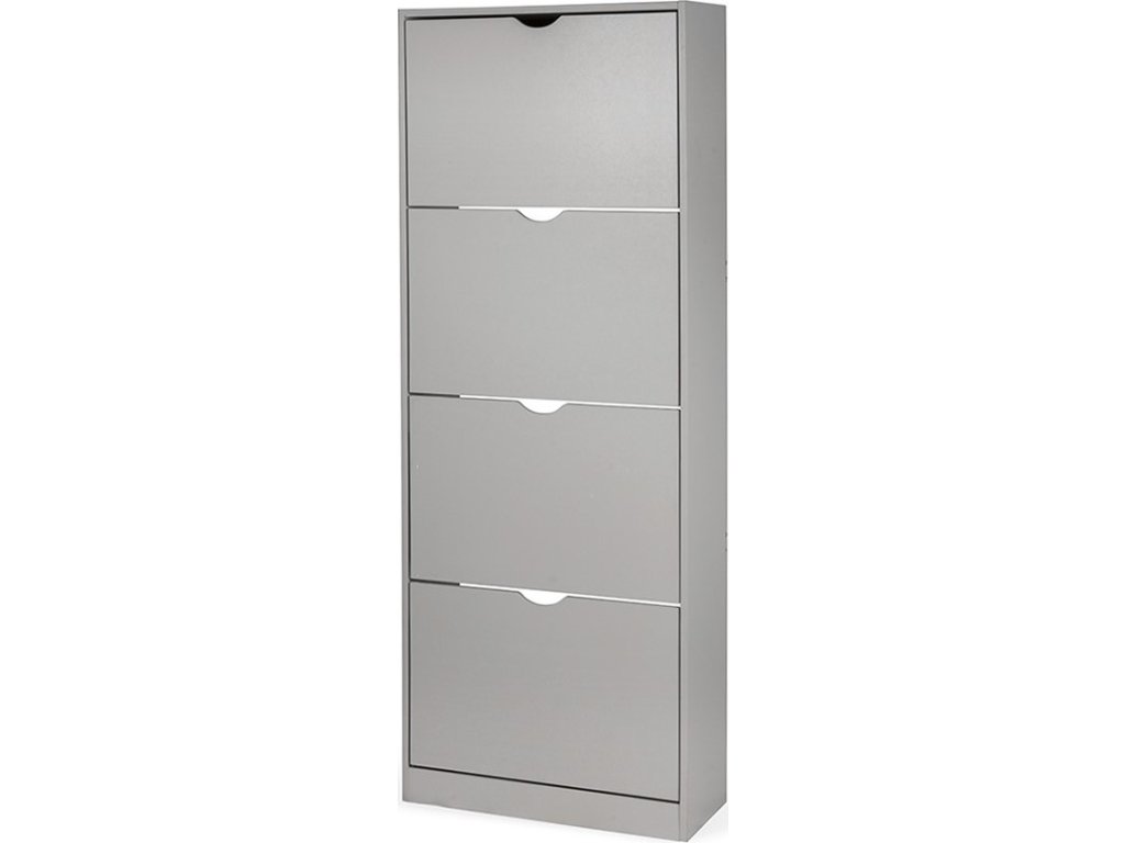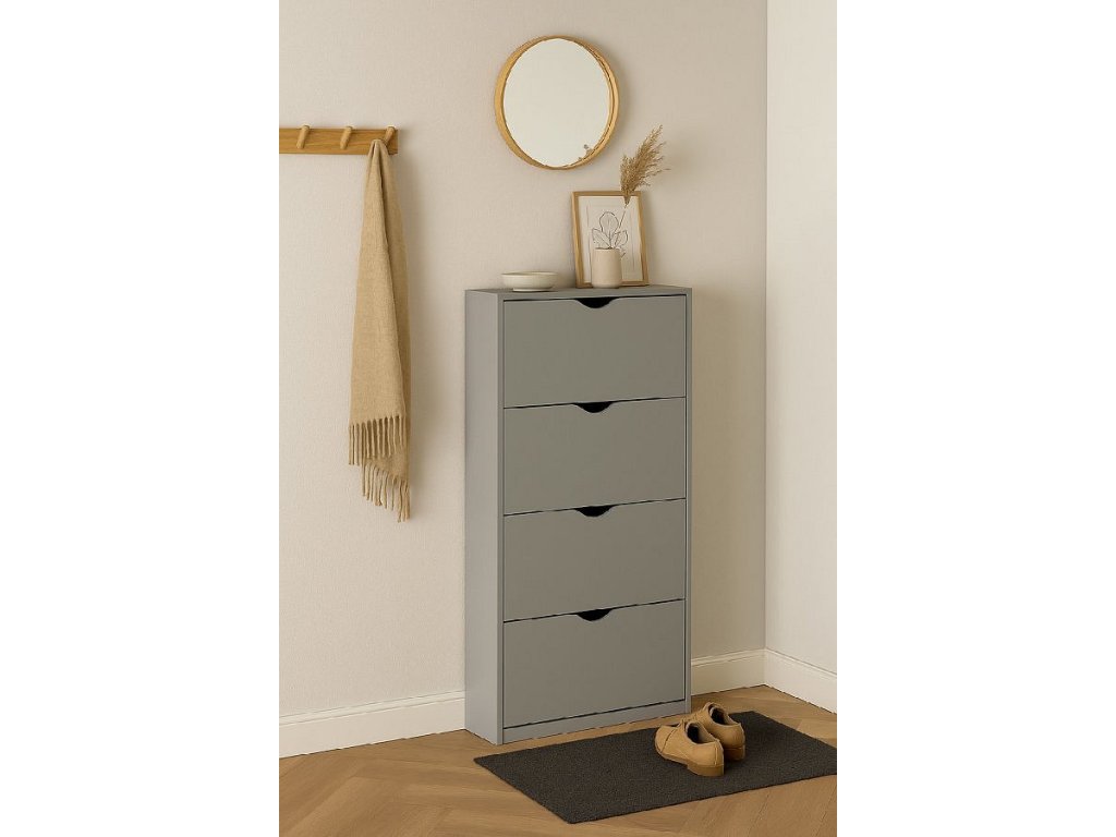 Botník z laminované dřevotřísky v šedé barvě, čtyři výklopné přihrádky, bez zadní desky.