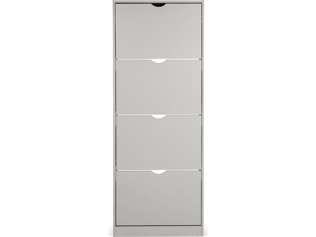 Botník z překližky v šedé barvě, čtyři výklopné přihrádky, bez zadní desky.