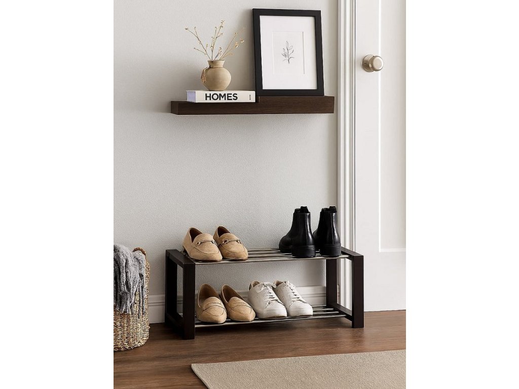 Jednoduchý a praktický botník se dvěma patry pro úsporu místa. Konstrukce z pevných kovových trubek zajišťuje stabilitu a dlouhou životnost. Boční rámy poskytují pevnou oporu a zároveň elegantní vzhled. Otevřený design umožňuje dobré větrání obuvi a snadný přístup. Vhodný do předsíně, chodby nebo šatny pro každodenní použití.