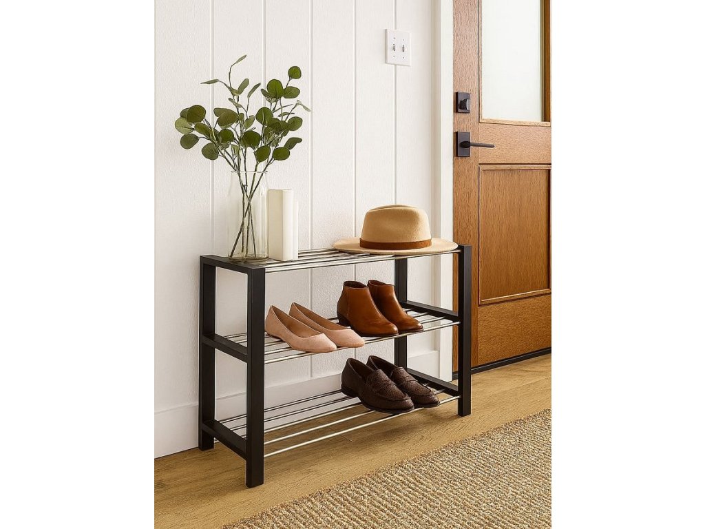 Jednoduchý a praktický botník se dvěma patry pro úsporu místa. Konstrukce z pevných kovových trubek zajišťuje stabilitu a dlouhou životnost. Boční rámy poskytují pevnou oporu a zároveň elegantní vzhled. Otevřený design umožňuje dobré větrání obuvi a snadný přístup. Vhodný do předsíně, chodby nebo šatny pro každodenní použití.