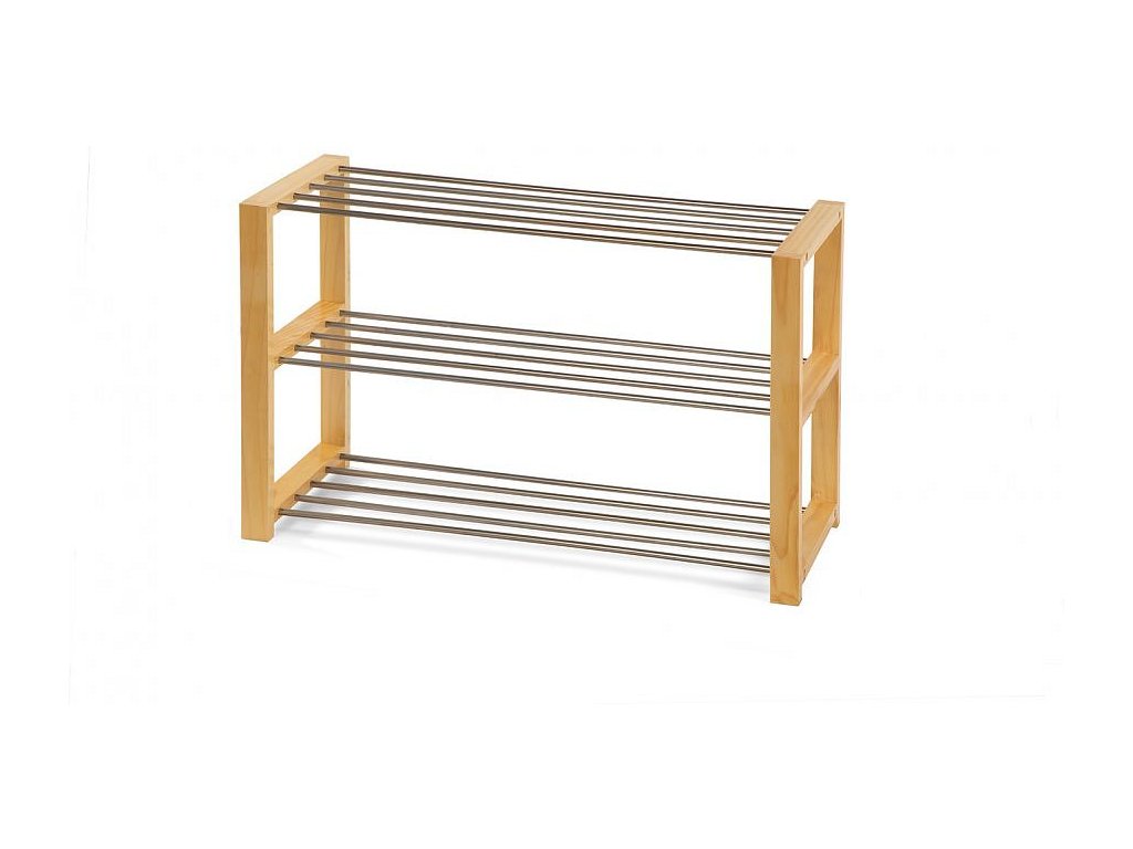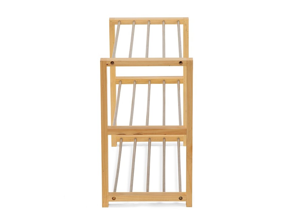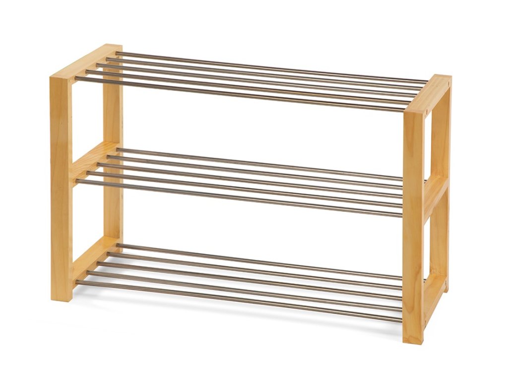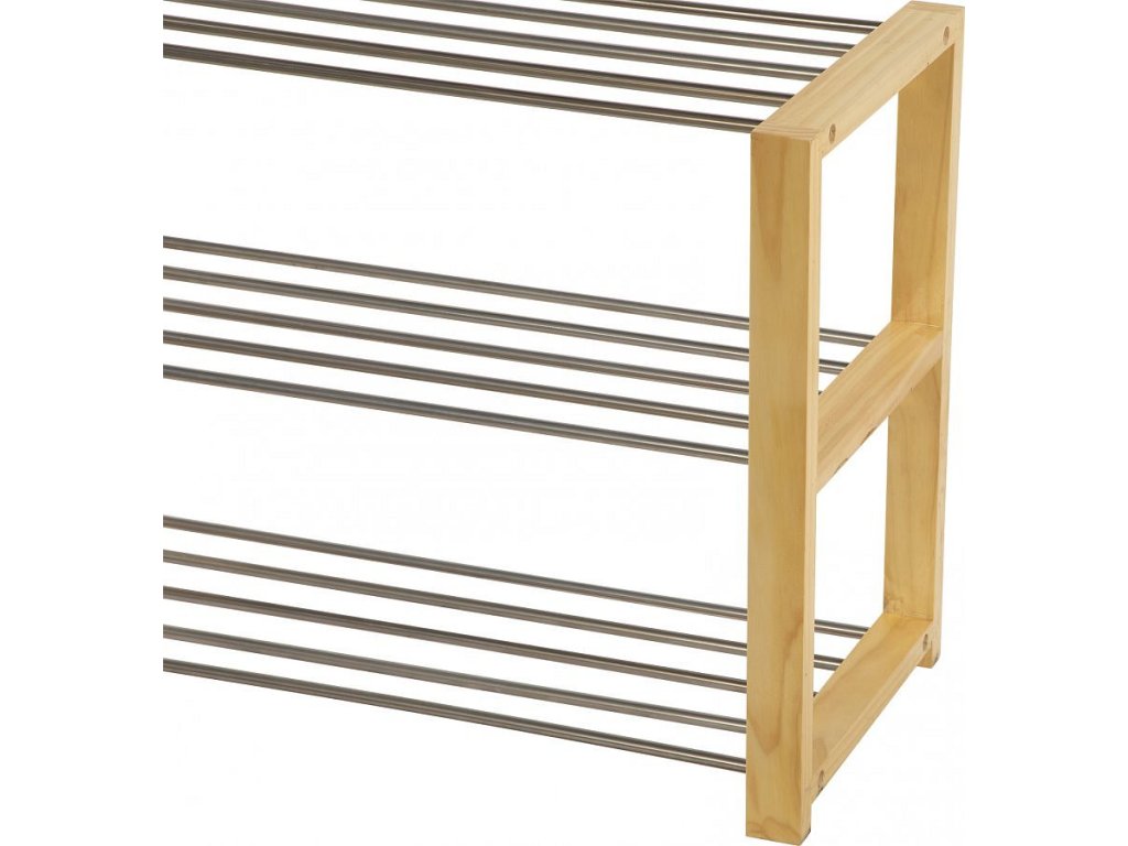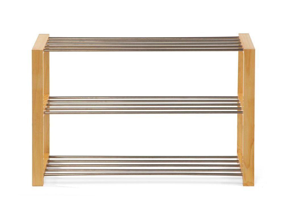 Botník s ocelovou konstrukcí v dekoru dřeva a ocelovými tyčemi ve stříbrné barvě.