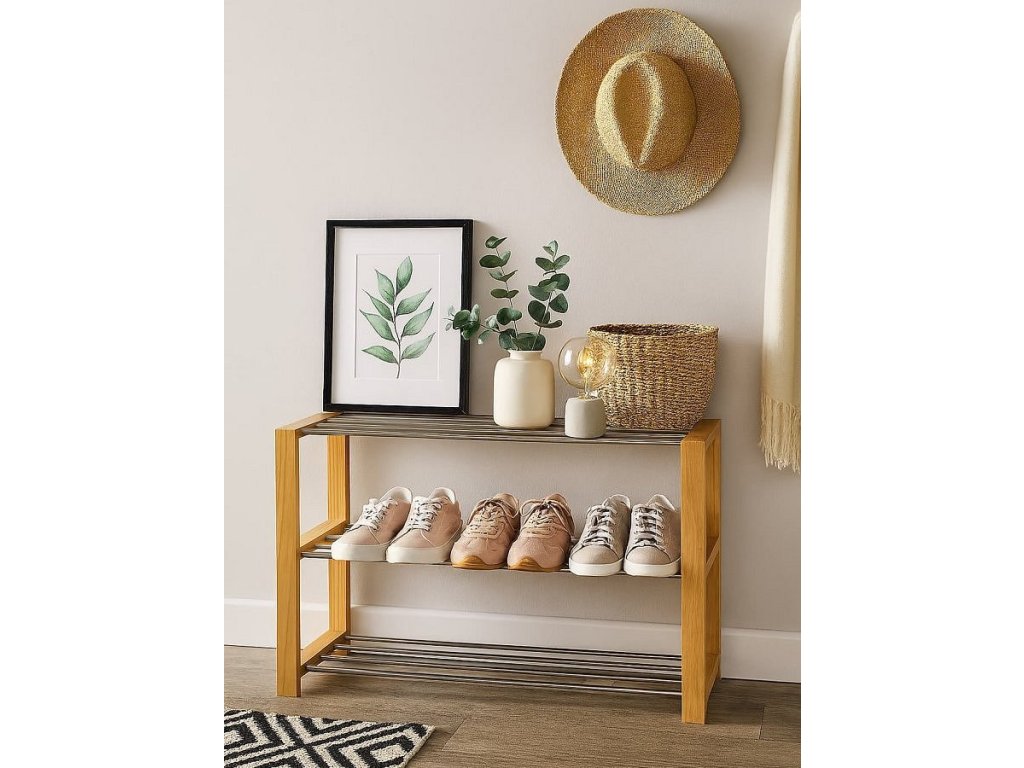 Jednoduchý a praktický botník se dvěma patry pro úsporu místa. Konstrukce z pevných kovových trubek zajišťuje stabilitu a dlouhou životnost. Boční rámy poskytují pevnou oporu a zároveň elegantní vzhled. Otevřený design umožňuje dobré větrání obuvi a snadný přístup. Vhodný do předsíně, chodby nebo šatny pro každodenní použití.