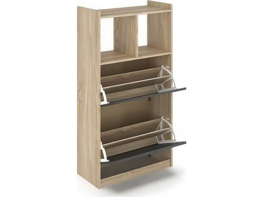 CASA 97042 Botník se dvěma výklopnými dvířky, vyrobený z desky LTD v barveném provedení dub sonoma. Výklopná dvířka jsou v barvě šedá. K botníku je možné dokoupit látkové organizéry v šedé barvě. Dodáváme v demontovaném stavu.