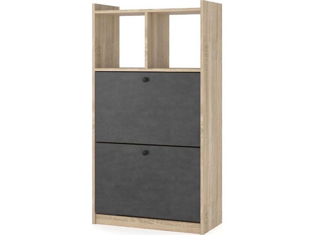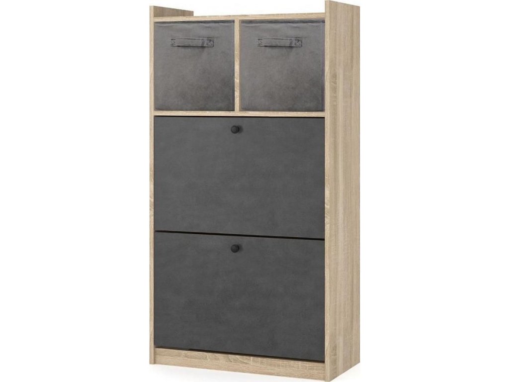 CASA 97042 Botník se dvěma výklopnými dvířky, vyrobený z desky LTD v barveném provedení dub sonoma. Výklopná dvířka jsou v barvě šedá. Součástí regálu jsou také 2 ks látkové organizéry v šedé barvě. Dodáváme v demontovaném stavu.