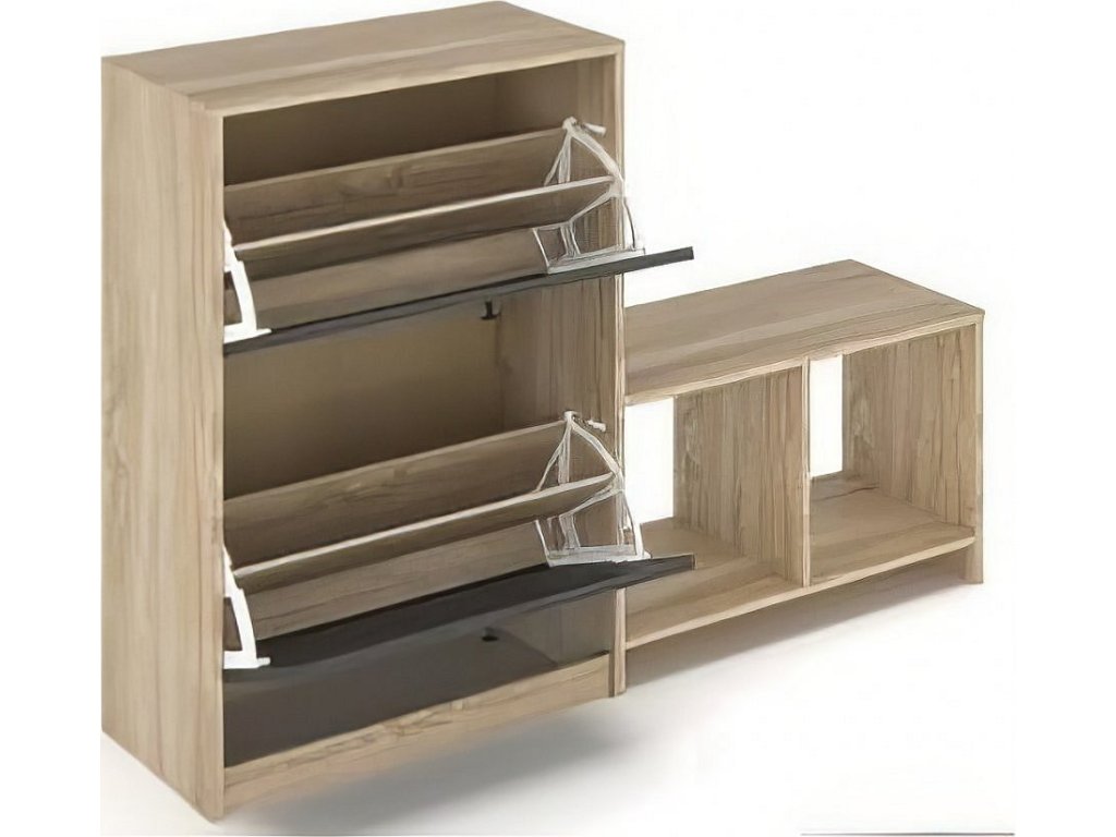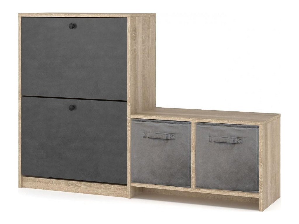 CASA 97043 Botník se dvěma výklopnými dvířky, vyrobený z desky LTD v barveném provedení dub sonoma. Výklopná dvířka jsou v barvě šedá. K botníku je možné dokoupit látkové organizéry v šedé barvě. Dodáváme v demontovaném stavu.