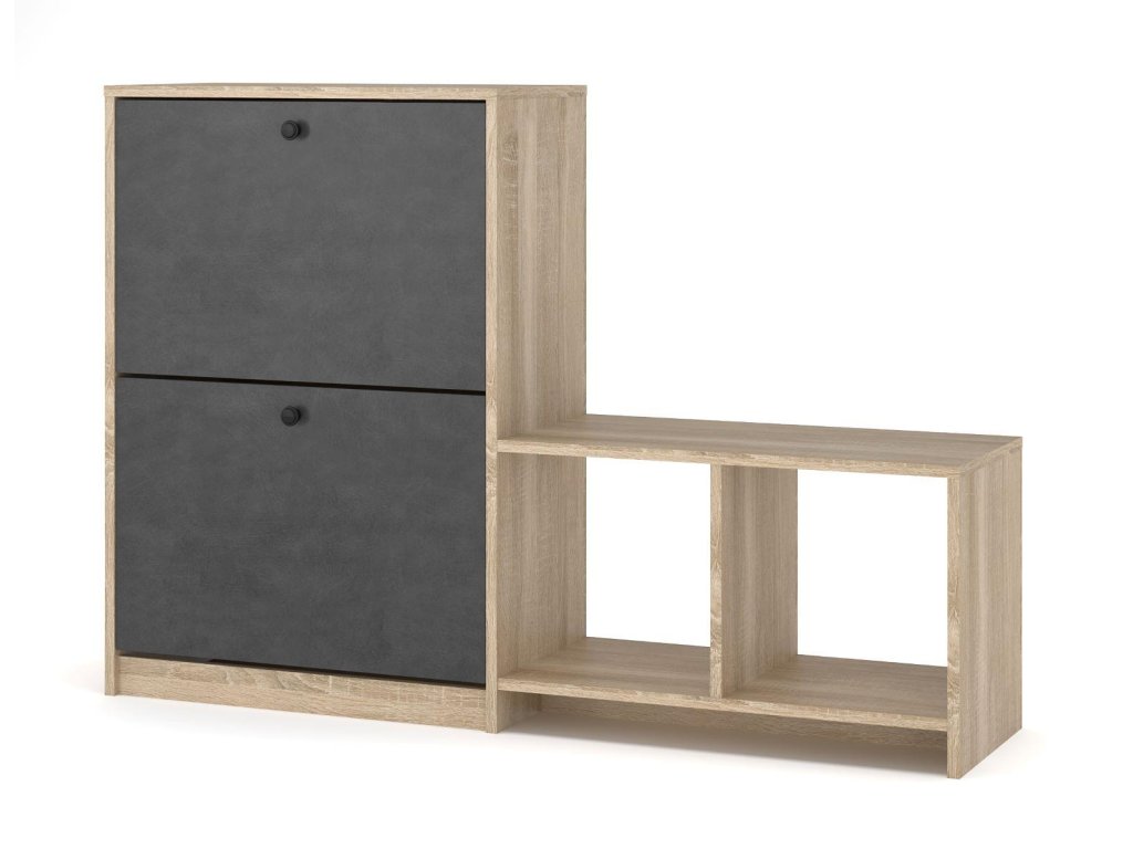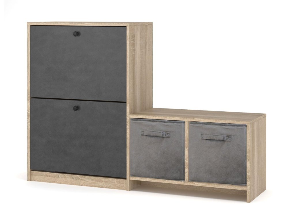 CASA 97043 Botník se dvěma výklopnými dvířky, vyrobený z desky LTD v barveném provedení dub sonoma. Výklopná dvířka jsou v barvě šedá. Součástí regálu jsou také 2 ks látkové organizéry v šedé barvě. Dodáváme v demontovaném stavu.