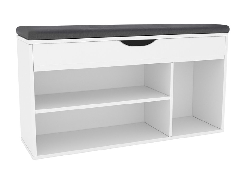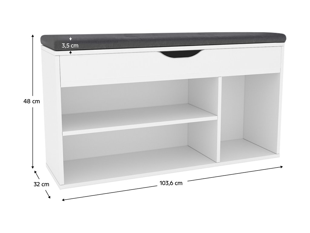 Materiál: DTD laminovaná Barva: bílá Rozměry (ŠxHxV): 103,6x32x48 cm S policemi S dvířky Nosnost botníku: Max. 90 kg Nosnost šuplíku: Max. 7 kg Výška polštářku: 3,5 cm Výplň: molitan Dodáván v demontu