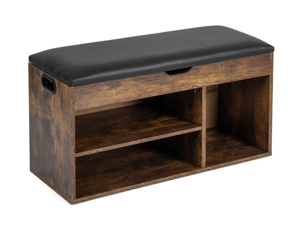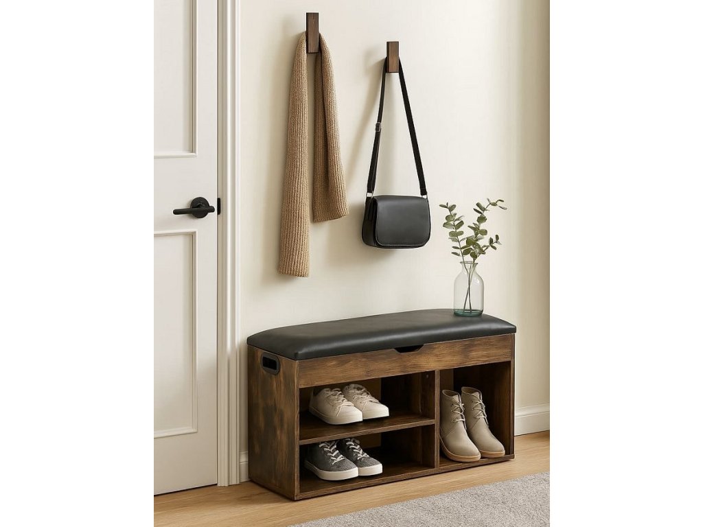 Praktický botník s víceúčelovým využitím. Horní část slouží jako pohodlná lavice s měkkým čalouněným sedákem a úložným prostorem. Otevřené police umožňují přehledné uložení obuvi a doplňků. Boční otvory pro snadnou manipulaci a přenášení. Spojuje funkčnost, komfort a elegantní vzhled do předsíně či chodby.