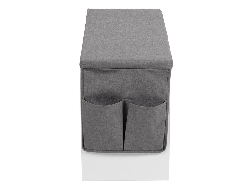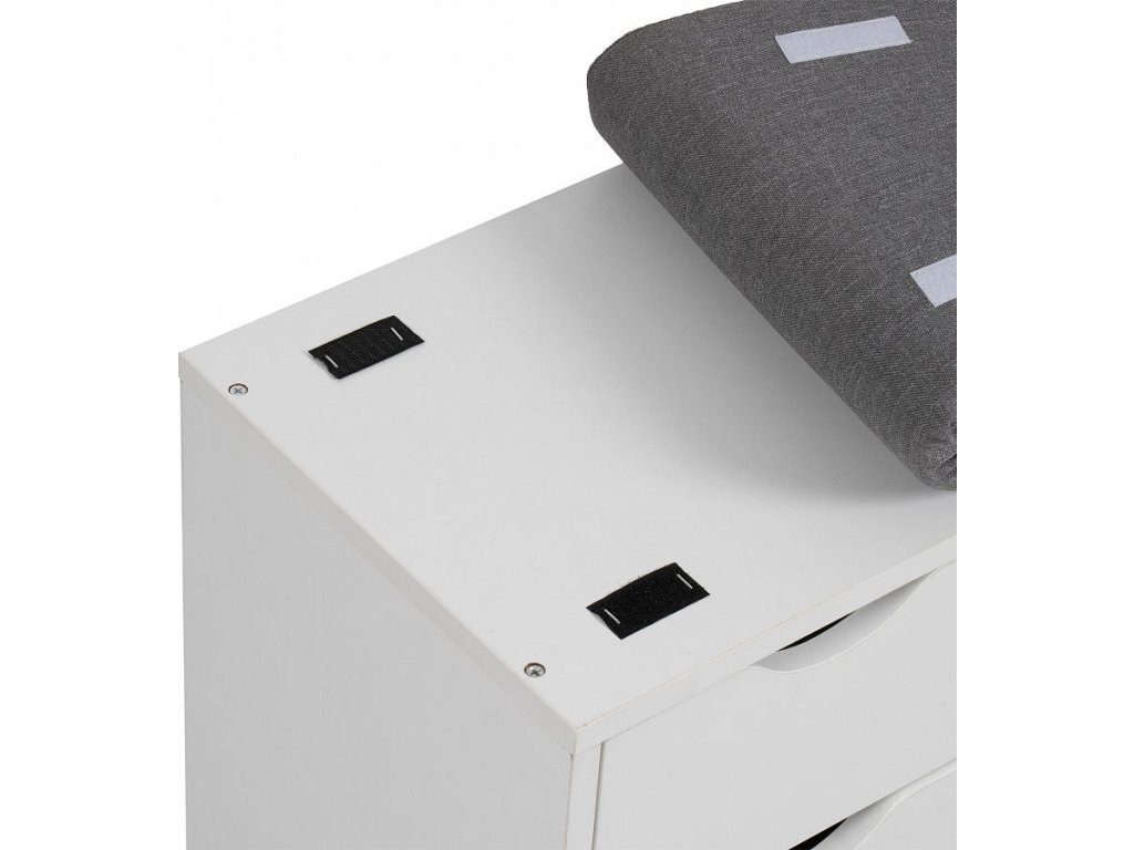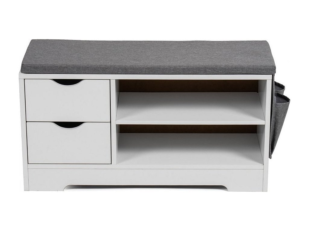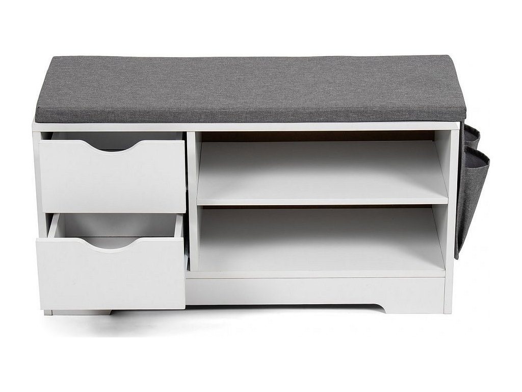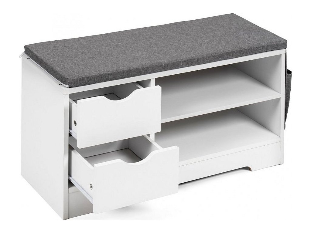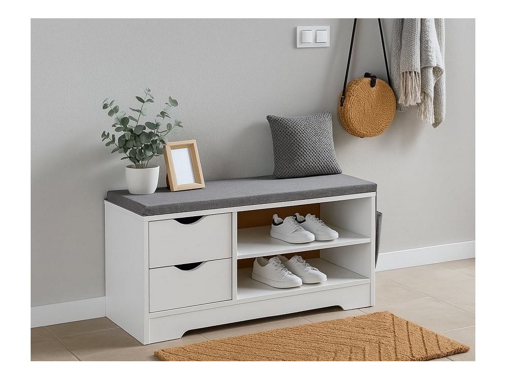 Botník s praktickým úložným prostorem a sedací plochou. Dvě zásuvky na drobnosti a dvě otevřené police na obuv. Měkký polstrovaný sedák pro pohodlné obouvání. Boční textilní kapsa pro další úložné možnosti. Funkční a elegantní doplněk do předsíně.