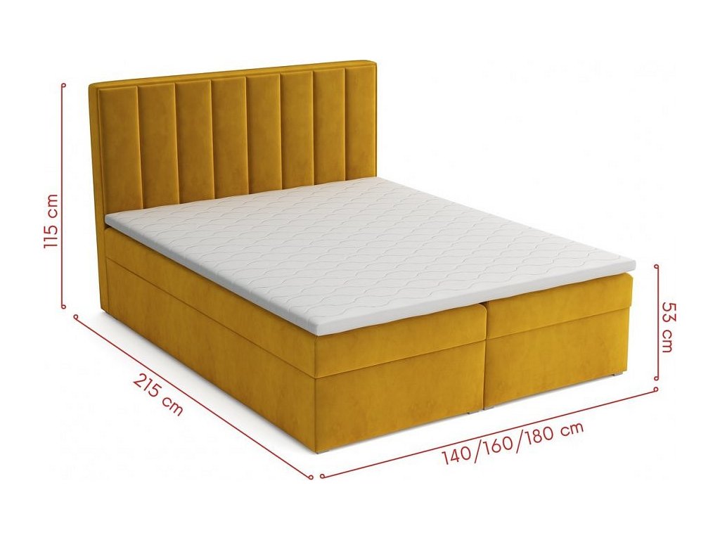 CASA 34020 Elegantní kontinentální postel moderního vzhledu s vysokým čelem s dekoračním prošíváním. Postel se dodává zároveň s matrací - boxspring styl. Pevná konstrukce postele je potažena látkou v barvě Bluvel 86. Na ní se nachází vysoká bonelová matrace potažena stejnou látkou. Na ní je druhá tenká matrace v celku vyrobena z kvalitní hrubé PUR pěny tzv. topper (výška cca 5 cm). Ložní plocha činí 180 x 200 cm. Výška ložné plochy od země je cca 53 cm. Rozměry úložného prostoru - 2x (197x67x30 cm). Úložný prostor je k dispozici nadzvednutím matrace z boční strany postele.