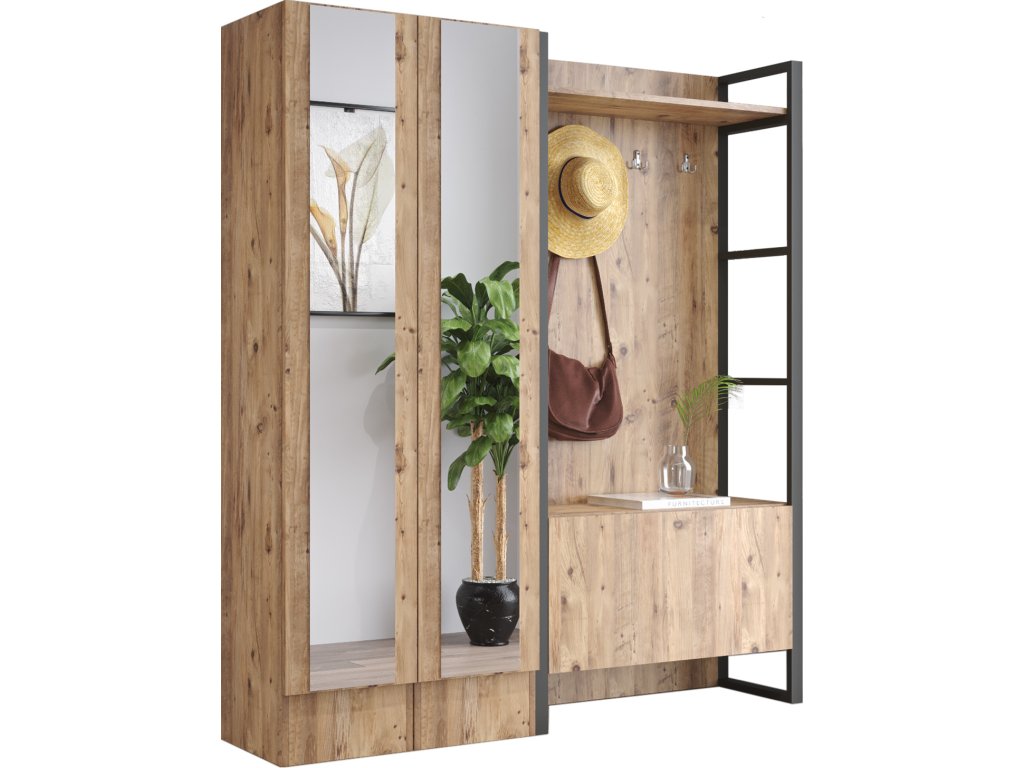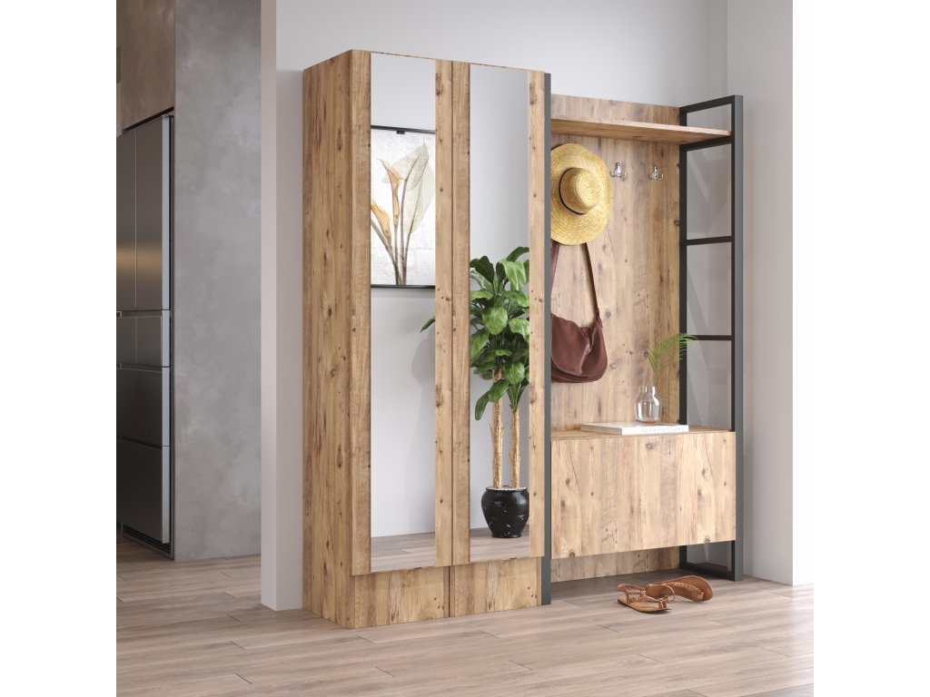 Stylová síňová sestava kombinuje funkčnost a moderní design, čímž přináší jedinečný vzhled do každé předsíně. Sestava je vyrobena z kvalitních materiálů, jako je LTD a kov, a zaujme svým loftovým a industriálním stylem. Obsahuje věšákovou stěnu se skříňkou a dvě skříně se zrcadlem, které zajistí dostatek úložného prostoru a praktičnost.