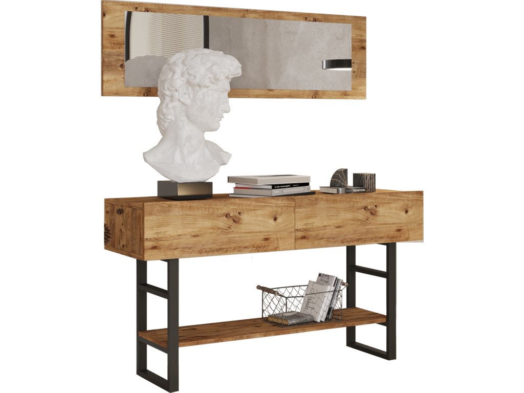 Konzolový stolek je stylovým a praktickým doplňkem do vašeho obývacího pokoje nebo předsíně. Díky industriálnímu designu, kvalitním materiálům LTD a kovu a propracovaným detailům přináší do vašeho interiéru jedinečný vzhled a funkčnost. Stolek je vybaven obdélníkovým zrcadlem, plnými dvířky a odkládací policí, což zajišťuje nejen estetickou, ale i praktickou hodnotu.