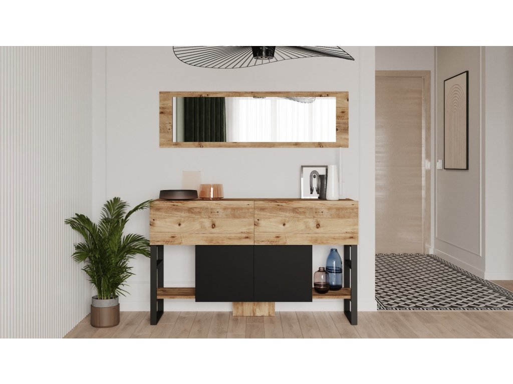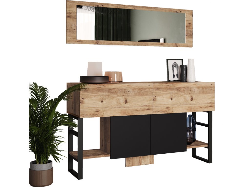 Konzolový stolek je stylovým a praktickým doplňkem do vašeho obývacího pokoje nebo předsíně. Jeho industriální design v kombinaci s kvalitními materiály LTD a kovem vytváří jedinečný vzhled, který zaujme na první pohled. Díky obdélníkovému zrcadlu, plným dvířkám a odkládací polici stolek nabízí nejen estetiku, ale i praktičnost.