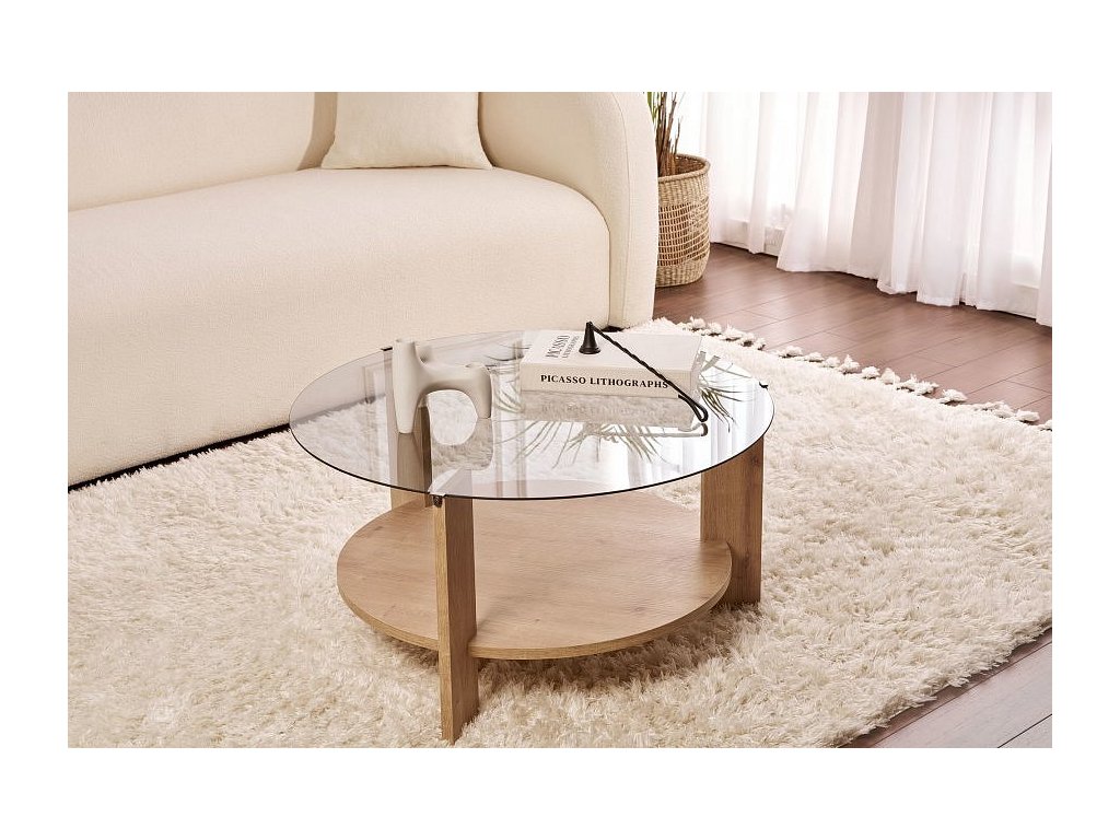 Proměňte svůj obývací pokoj ve stylové a příjemné útočiště s naším nádherným konferenčním stolkem. Kombinace tvrzeného skla a dřevotřísky s melaminovým povlakem vytváří luxusní vzhled, který ohromí vaše hosty a pozvedne celkovou estetiku vašeho domova.