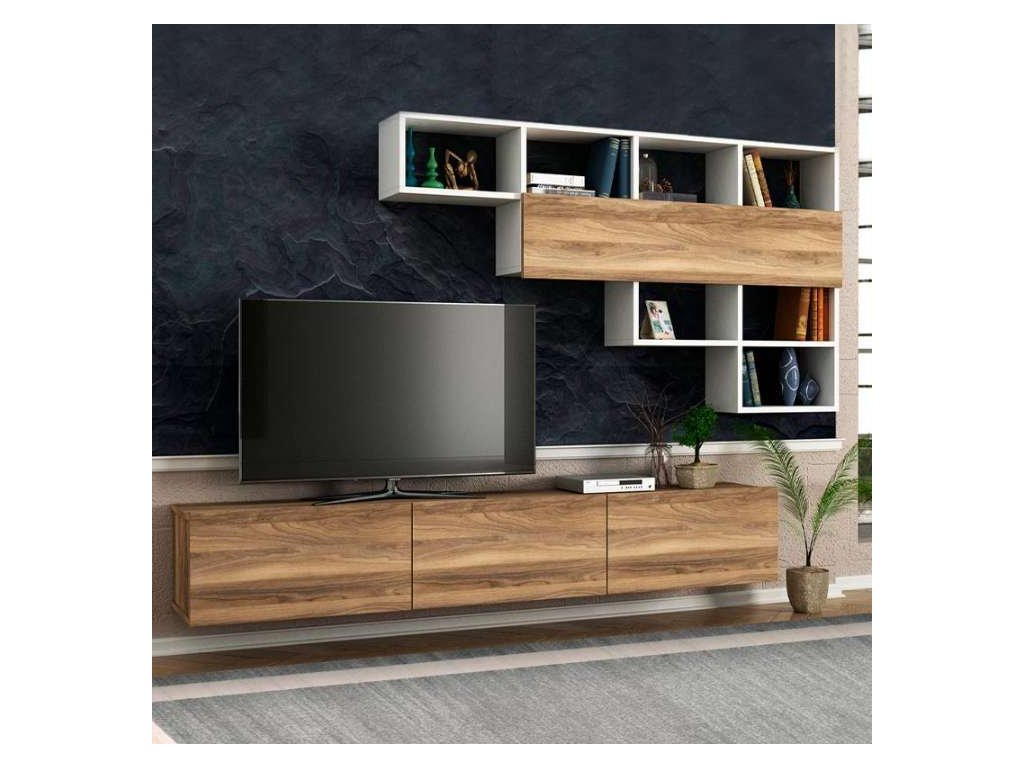 - Rozměry: Sestava zahrnuje TV stolek (180 x 29.5 x 30 cm) a nástěnnou polici (150 x 19.5 x 87 cm), poskytující široké možnosti uspořádání a skladování vašich multimediálních zařízení a dekorací.