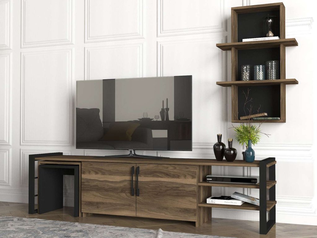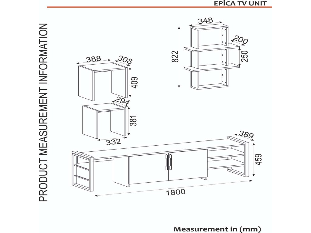 - Rozměry: Hlavní TV stolek má rozměry 180 x 39 x 46 cm, doplněný o nástěnnou polici (35 x 20 x 82 cm) a dva odkládací stolky (39 x 31 x 41 cm), které jsou vsunuty dovnitř TV stolku pro elegantní a praktické uspořádání.