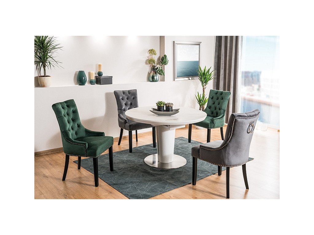 CASA 11803 Atraktivní, velice pohodlná čalouněná židle - křeslo v novodobém stylu glamour. Tento dominantní kus nábytku vnese do Vašeho interiéru eleganci a bude jednoduše nepřehlédnutelný. Nohy jsou ze dřeva v černé barvě, čalounění sedáku je vyrobeno z potahové látky AKSAMIT v šedé barvě. Kovové zdobení po obvodu a na zádech židle dodá ještě větší nádech luxusu. Pohodlí a elegance pro každý interiér.