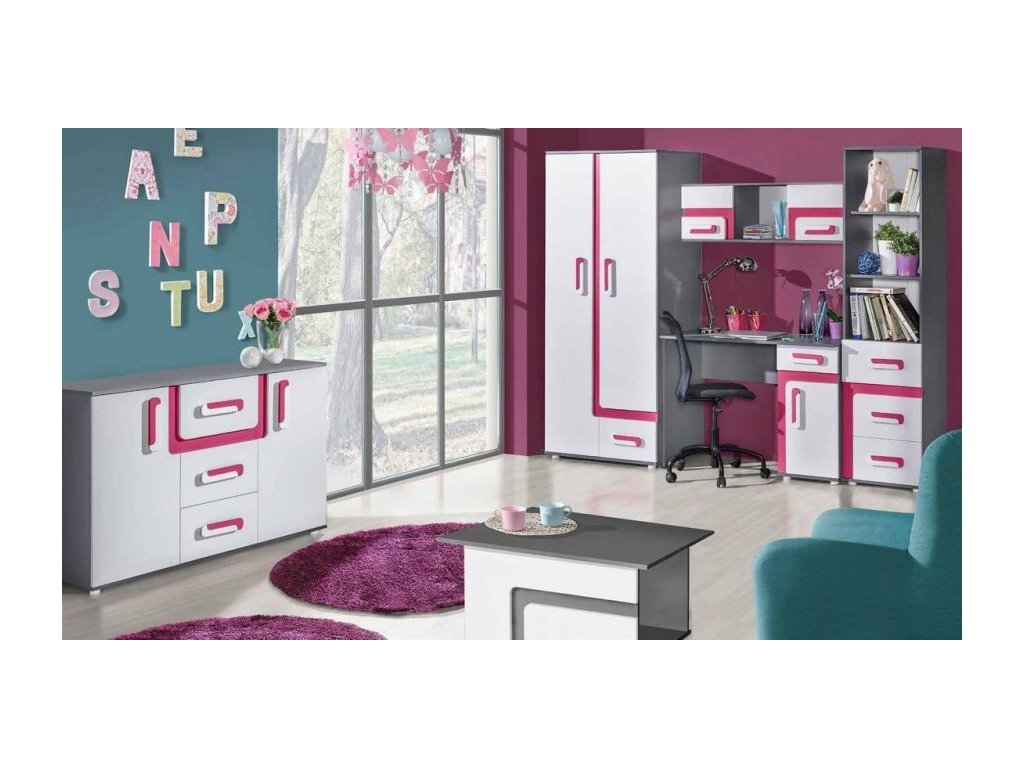 CASA 23001 Skříň APETTITA ze sektorové řady, která se vyznačuje netradičním zpracováním barev a originalitou úchytů. Tento styl nábytku zaujme každou mladší generaci. Skříň je vyrobena z kvalitní LTD desky hraněné ABS lištou. Korpus je v barvě šedá antracit, dveře jsou bílé matné, doplňková barva je růžová. Úchytky jsou v barevné kombinaci růžová/bílá. Uvnitř skříně jsou police, v dolní části zásuvky. Sektorový nábytek APETTITA má široký výběr prvků, který Vám zaručí sestavit si dětský nebo studentský pokoj, ložnici či kancelář podle svých potřeb, přání a představ. Dodáváme v demontovaném stavu.