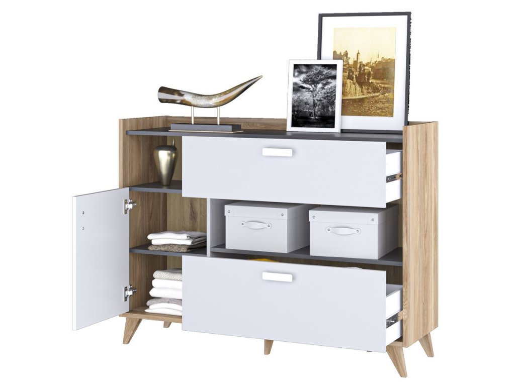 CASA 73036 Sestava do dětského pokoje v moderním stylu a geometrických tvarech. Nábytek je vyroben z desky LTD hraněné páskou ABS, korpus je v barvě dub castello medový, dvířka a zásuvky jsou v kombinaci barev šedá/bílá alpská. Sestava se skládá z těchto položek (Š x V x H cm) - šatní skříň (85 x 187 x 51 cm), komoda (130 x 97 x 40 cm), komoda se zásuvkami (90 x 97 x 40 cm), pracovní stůl (111 x 81 x 55 cm), závěsná police (110 x 20 x 22 cm), noční stolek (38 x 52 x 40 cm) a postel (96 x 99 x 208 cm). Čelo postele je doplněno polstrováním v šedé barvě. Nožky nábytku mají netradiční zkosený tvar a jsou v barvě dub castello medový. Postel má lamelový rošt v ceně, matraci je třeba dokoupit, Vhodný rozměr matrace je 90 x 200 cm. Dodáváme v demontovaném stavu.