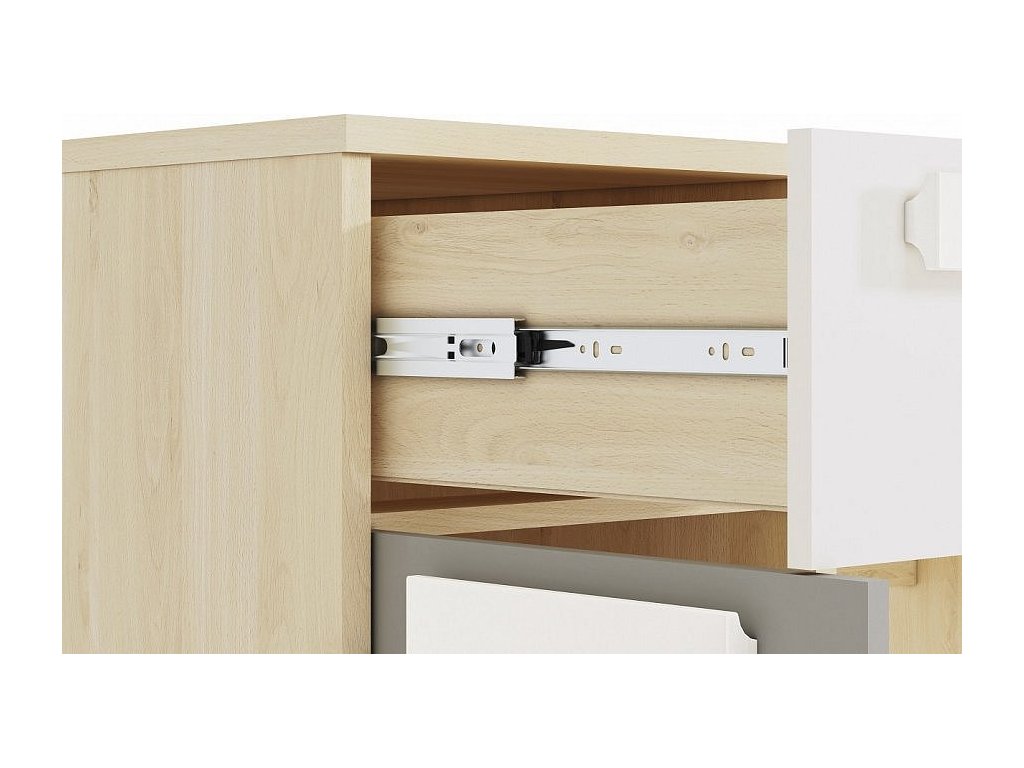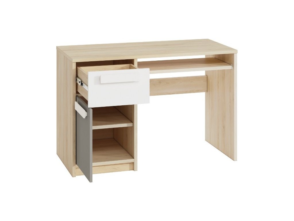 Psací stůl DIVO je vyrobený z lamina + ABS hran v kombinaci barev buk fjord/dvířka bílá/šedá. Hodí se tak do pokojíčku dívek i chlapců.
