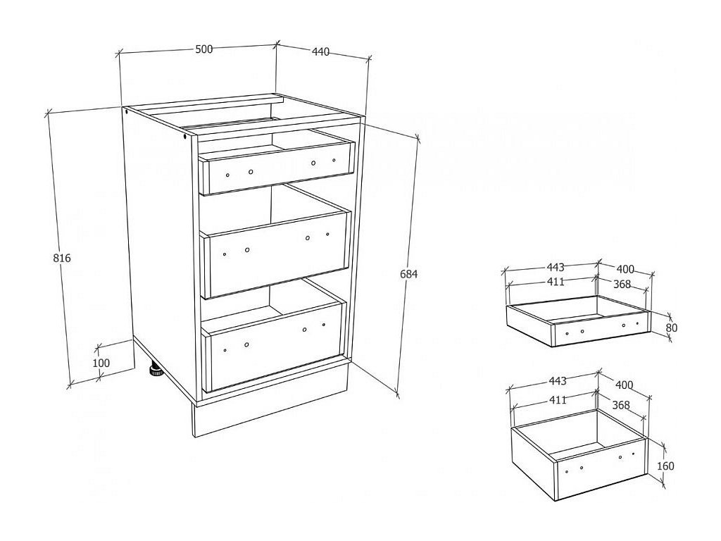 Prostorná dolní kuchyňská skříňka VCM je vybavena 2 většími a 1 menší zásuvkou v antracitovém provedení. Uvnitř je k dispozici spousta místa, což přijde v kuchyni vždy vhod.