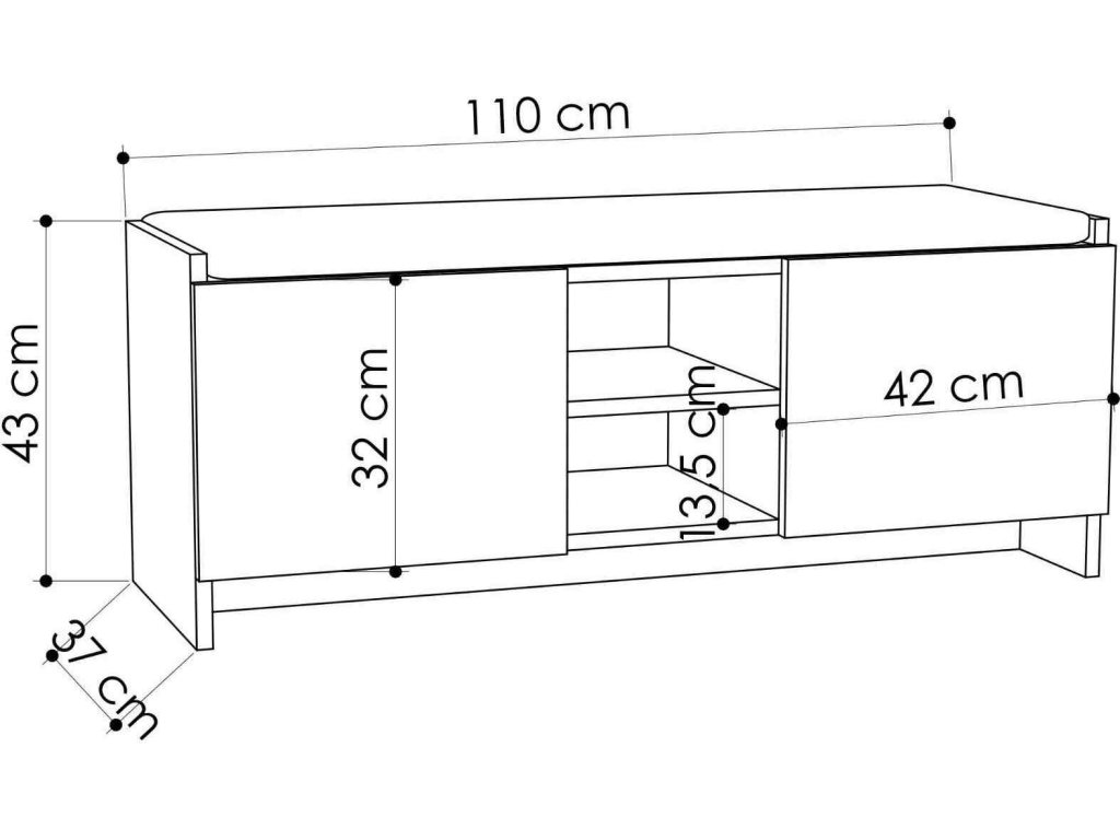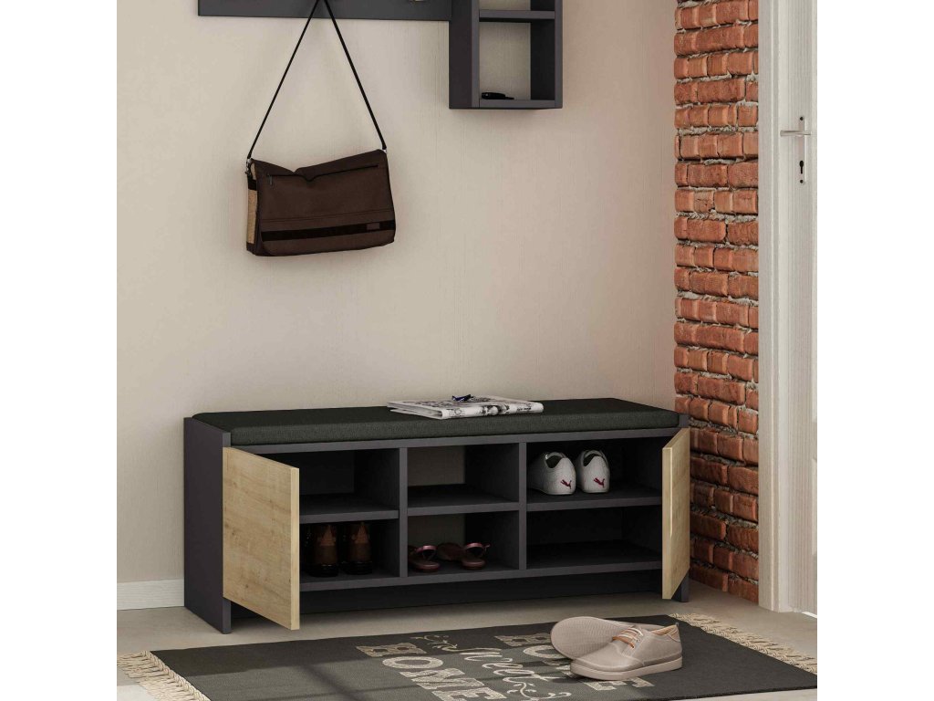 Díky svému jedinečnému kombinovanému designu v barvách antracitu a dubu přináší do vašeho domova nádech luxusu. Vysoce kvalitní melamin, VT laminát a látka zajišťují odolnost a dlouhou životnost. Funkční dvířka skrývají prostornou skříňku pro vaše boty, zatímco praktický regálek a lavice poskytují další úložný prostor a místo k sezení.