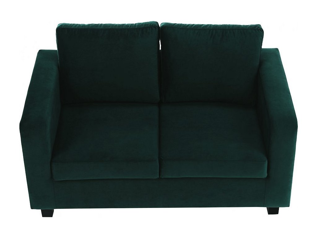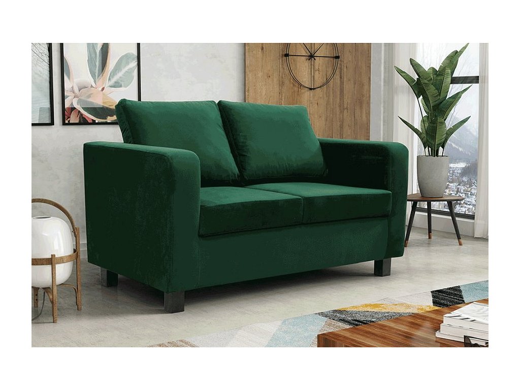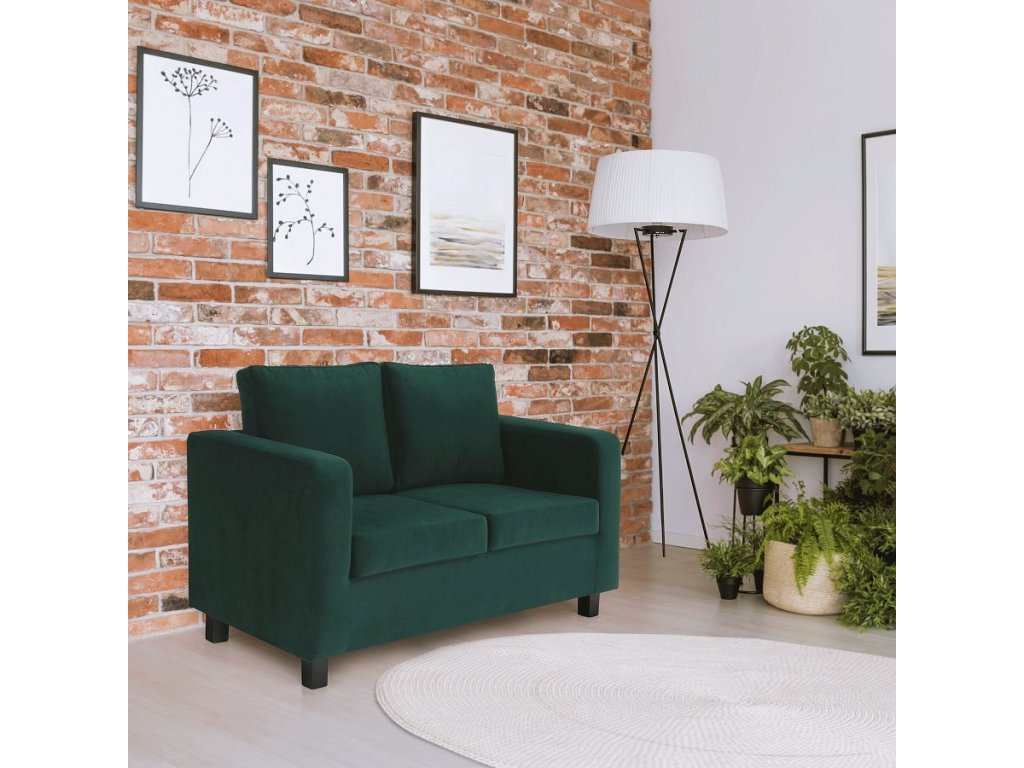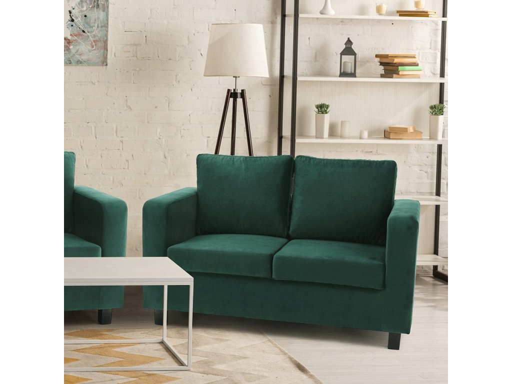 Elegantní dvoumístná pohovka LUANA, potažena ve smaragdové látce. Pohovku je možné doplnit křeslem a trojmístnou pohovkou ve stejném designu. Jádro sezení pružina Faliste a PUR pěna.