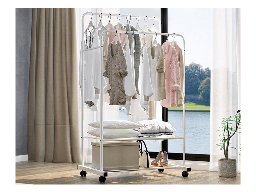 Materiál: kov Barva: bílá Rozměry (ŠxHxV): 80x51x160 cm pevná konstrukce dvě police Dvě věšákové tyče dvouřadý věšák Stojan na oblečení kolečka 2 kolečka s brzdou Nosnost: 30 kg Dodávané v demontu