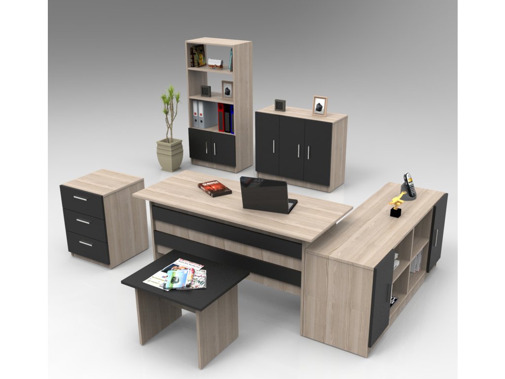 je kompletní řešení pro vaši pracovnu. Psací stůl poskytuje pohodlný prostor pro práci, konferenční stolek je ideální pro jednání nebo odkládání dokumentů, tři komody nabízejí variabilní úložný prostor a regál umožňuje organizaci knih, šanonů nebo dekorací. Tento set spojuje praktičnost a moderní design pro maximální komfort a efektivitu.
