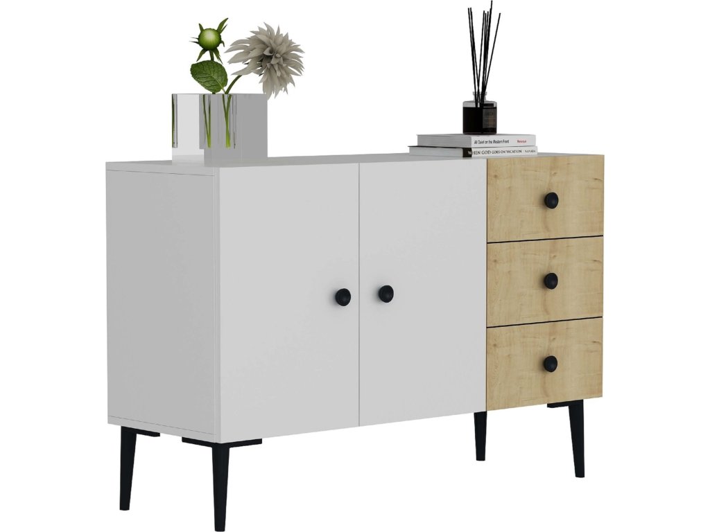 Komoda je perfektní volbou pro moderní obývací pokoj, kde kombinuje eleganci s praktickým úložným prostorem. S třemi plnými dvířky poskytuje dostatek místa pro uspořádání vašich věcí, ať už jde o knihy, dekorace nebo jiné drobnosti.