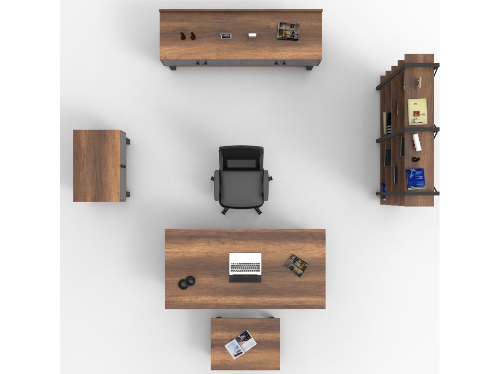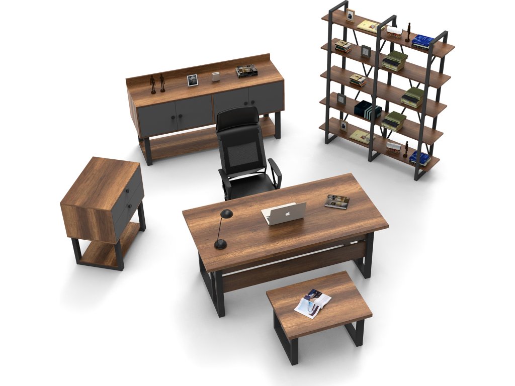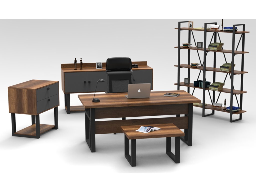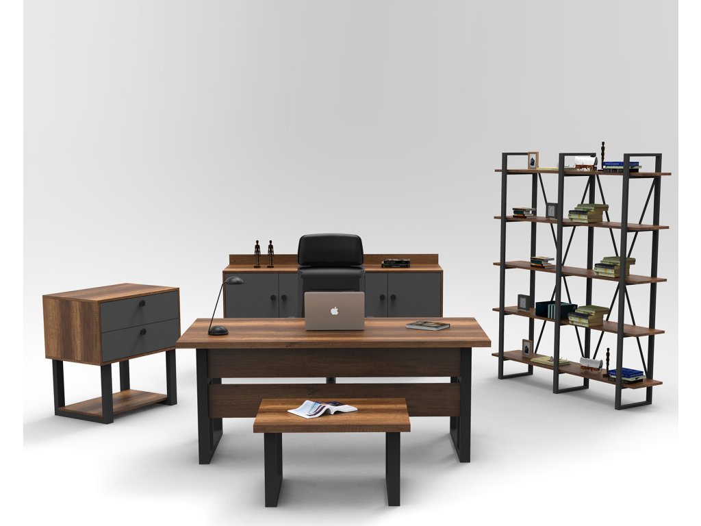 Kancelářský set je perfektním řešením pro moderní a funkční pracovnu. Tento set spojuje odolné materiály LTD a kov s industriálním designem, čímž přináší stylový vzhled a vysokou praktičnost. Sestava obsahuje psací stůl, konferenční stolek, malou komodu, konzoli a policový regál, které dohromady tvoří harmonický celek pro efektivní organizaci a práci.