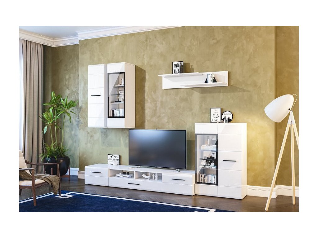 Moderní obývací stěna vás zaujme svým moderním designem v bílém lesku. Obývací pokoj je vyroben z 16 mm laminované desky, která je známá svou odolností a dlouhou životností. Korpus je v bílém matném provedení, dvířka jsou v bílém lesku.