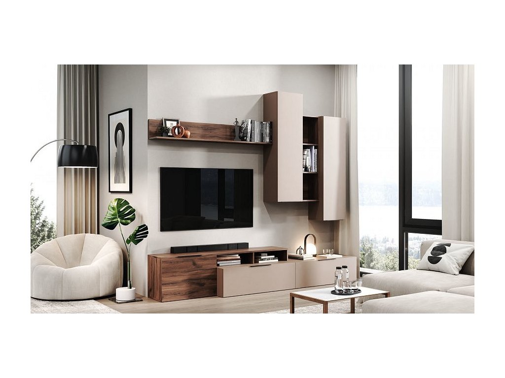 Obývací stěna je vyrobena z 16 mm laminované desky, která je známá svou odolností a dlouhou životností. Přední čela v barvě toffi zdobí elegantní černé úchyty.
