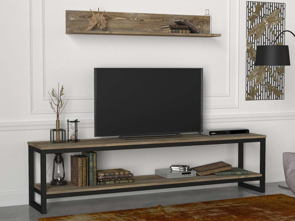 Představujeme obývací stěnu, která přináší do vašeho obývacího pokoje stylový loftový a industriální design. Tato stylová sestava v kombinaci hnědé a černé barvy je navržena tak, aby poskytovala praktické a estetické řešení pro vaše multimediální zařízení a další potřeby.