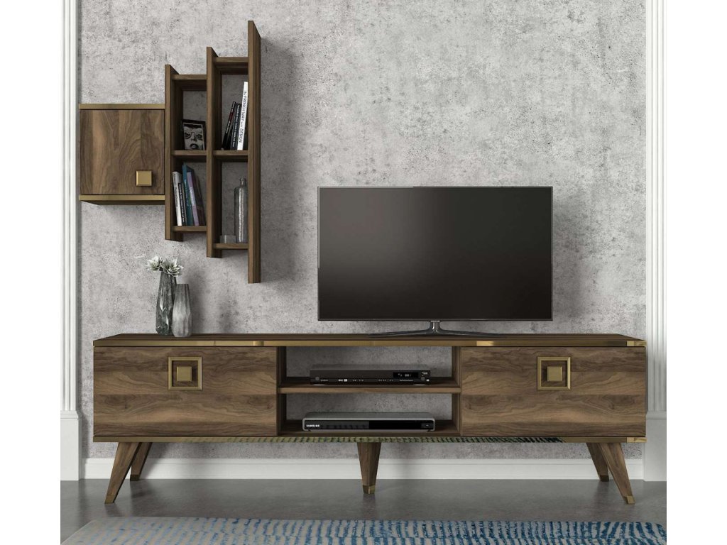 Představujeme obývací stěnu, která přináší do vašeho obývacího pokoje eleganci a moderní design. Tato stylová sestava v ořechové barvě je navržena tak, aby poskytovala praktické a estetické řešení pro vaše multimediální zařízení a další potřeby.