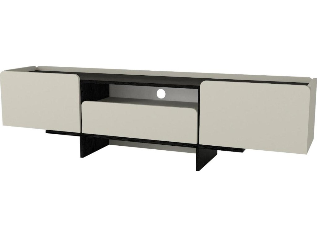 Televizní stolek nabízí dostatek úložného prostoru díky třem dvířkům, za kterými se nachází praktické skříňky, a odkládacím policím pro vaše elektronická zařízení a dekorace. Vyroben z kvalitního materiálu LTD s tloušťkou 18 mm, zajišťuje tento stolek pevnost a dlouhou životnost. Kombinace černé a béžové barvy přidává vašemu obývacímu pokoji moderní a sofistikovaný vzhled.