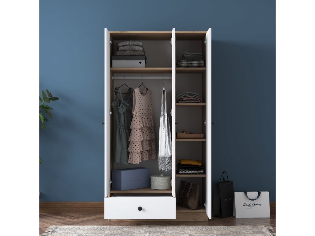 Šatní skříň je stylovým řešením pro organizaci vašeho oblečení a doplňků. Kombinace bílé barvy a dekoru ořechu dodává interiéru moderní a příjemnou atmosféru. Díky promyšlenému uspořádání poskytuje dostatek prostoru pro vše, co potřebujete mít přehledně uložené.