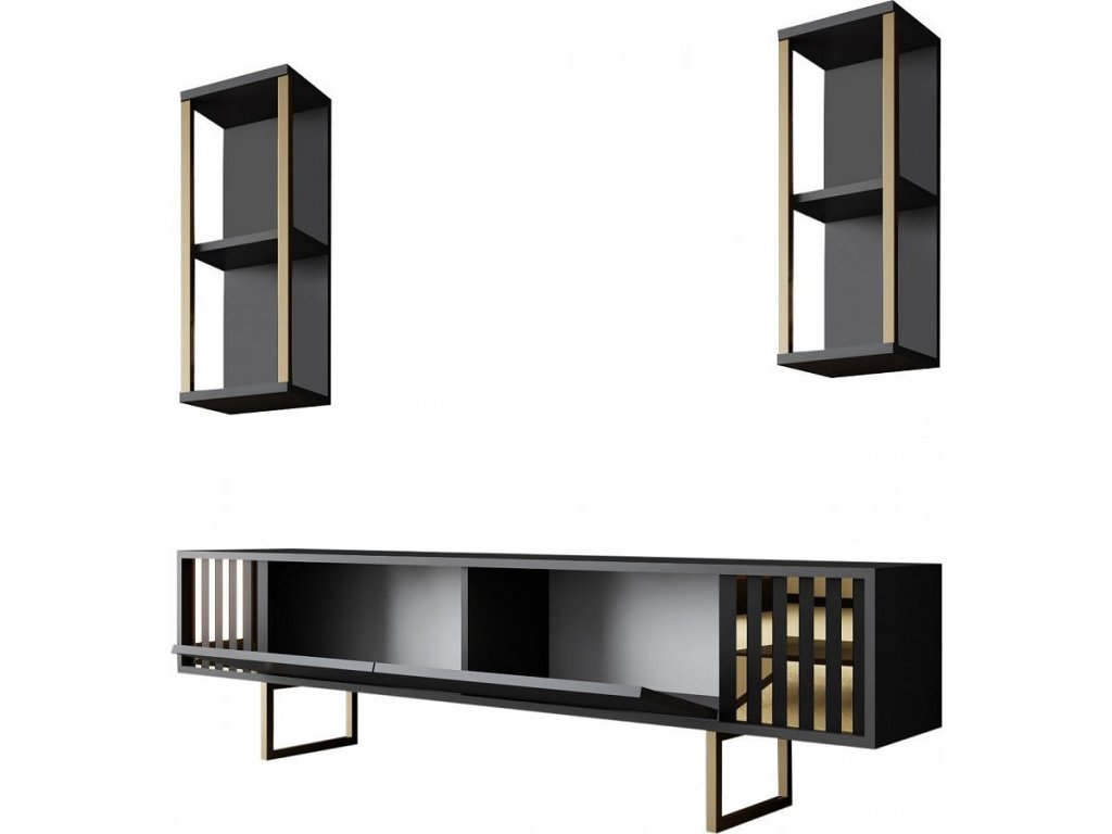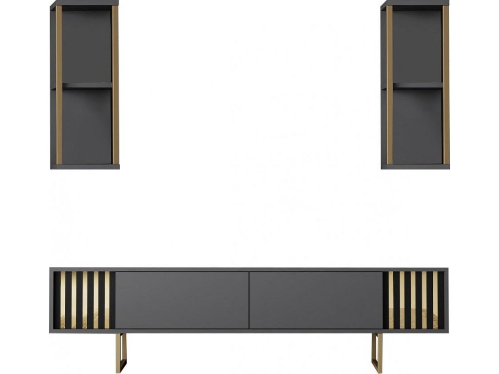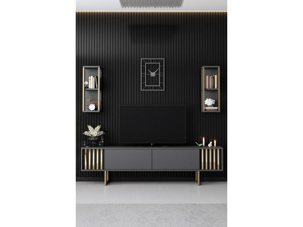S televizním stolkem o rozměrech 180 cm na šířku, 30 cm na hloubku a 48 cm na výšku nabízí tento stolek dostatek prostoru pro umístění televize a dalších mediálních zařízení. Dvě nástěnné police, každá o šířce 22 cm, hloubce 21 cm a výšce 60 cm, poskytují další úložný prostor pro vaše oblíbené knihy, dekorativní předměty nebo mediální příslušenství.