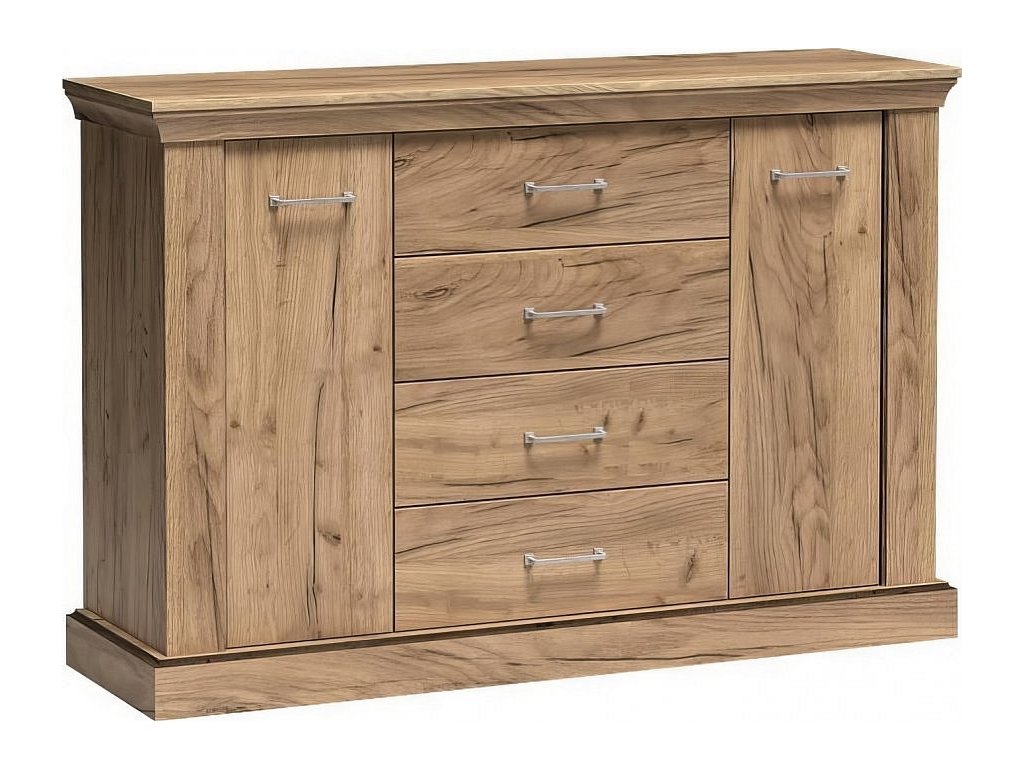 CASA 71001 Komoda se zásuvkami. Komoda má 2 dvířka a 4 praktické zásuvky. Kolekce nábytku v sobě spojuje jednoduchost, krásný vzhled a funkčnost. Jedná se o stylovou kolekci nábytku rustikálního stylu, který je vhodný jak do ložnice tak do obývacího pokoje. Jeho barevné provedení vnese do domova lehkost a eleganci. Barevné provedení - dub zlatý kraft. Nábytek je vyroben z kvalitního lamina ohraničeného ABS páskou. Kolekce se skládá z mnoha prvků a tento široký výběr vám zaručí sestavit si nábytek podle svých vlastních představ a přání. Dodáváme v demontovaném stavu.