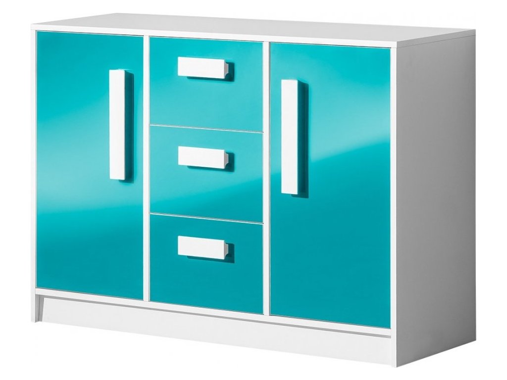 GOLIÁŠ 6- komoda nízká se 2 dvířkami 3 šuplíky (GULIVER 6)-korpus bílá/dvířka tyrkysová lesk/úchyt bílá (DO) (K150-E)
