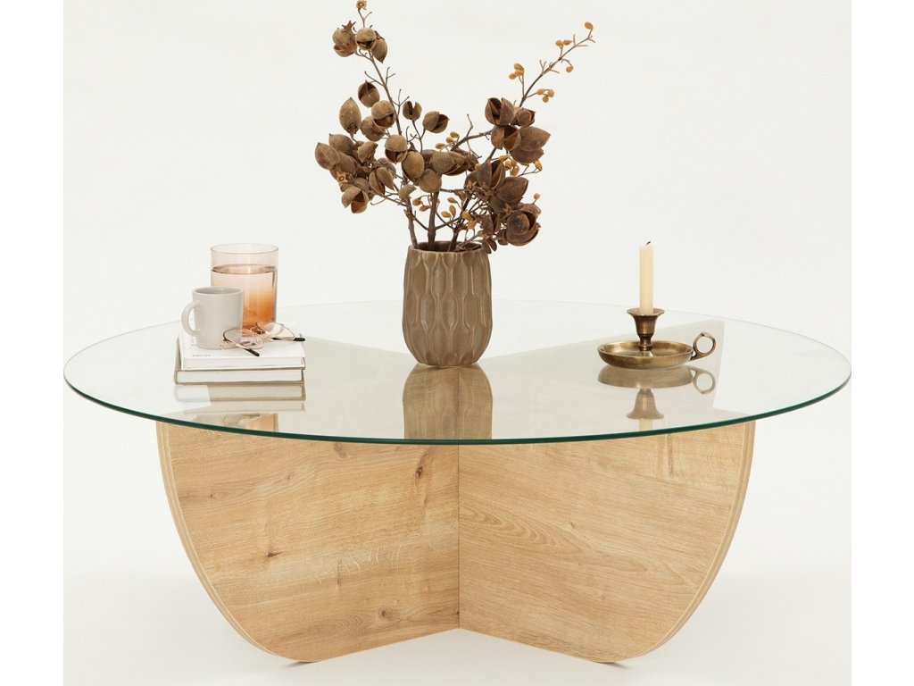 Konferenční stolek vyniká svým kulatým designem a sofistikovaným dubovým dekorem Sapphire. Tento stylový kousek je ideální volbou pro váš obývací pokoj, kde propojuje eleganci a funkčnost.