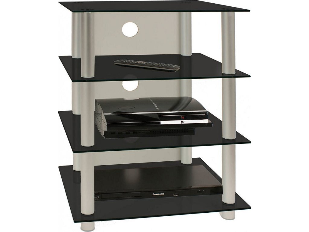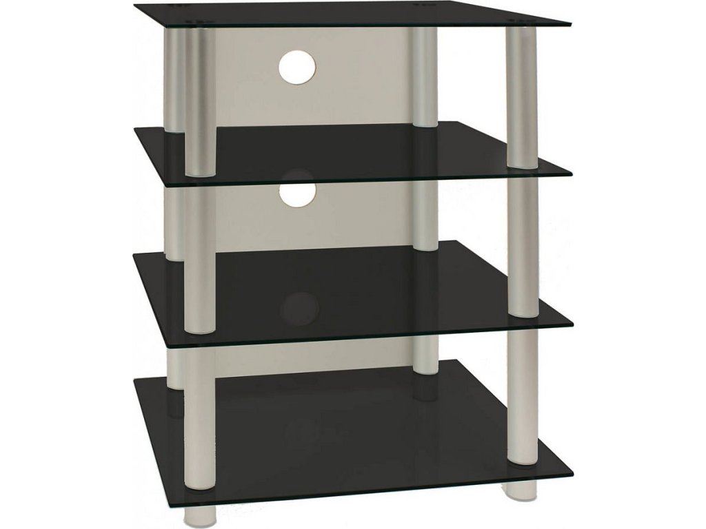 Elegantní hi-fi nábytek se čtyřmi robustními policemi vyrobenými z 5mm tvrzeného bezpečnostního skla a hliníkovými sloupky.