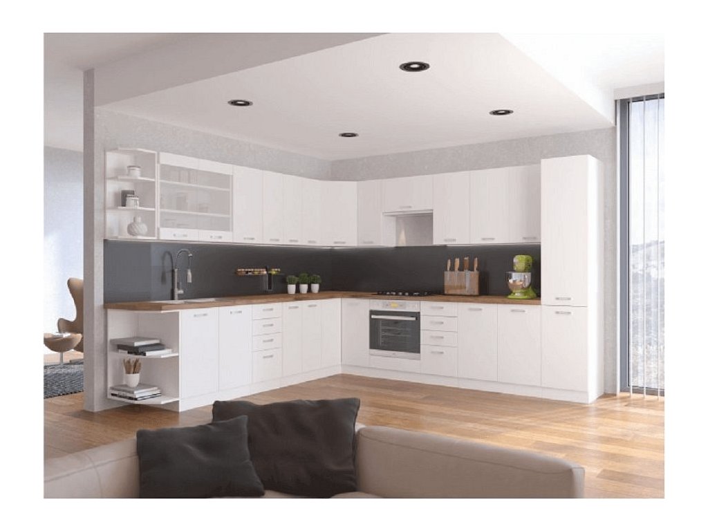 Spodní skříňky jsou dodávány včetně dolní lišty. Pracovní deska není součástí skříněk. Je možné si doobjednat pracovní desku v provedení dub lancelot za1590 kč / bm. Možnost dokoupení univerzálního L / P dřezu LAY ON.