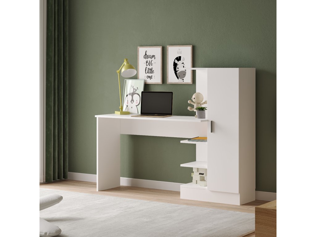 Psací stůl je ideálním spojením moderního designu a funkčnosti. Vyroben z kvalitního LTD materiálu v čisté bílé barvě, tento stůl je navržen ve skandinávském stylu, který přináší do prostoru eleganci a jednoduchost. S praktickým vybavením, jako jsou plná dvířka a regálek, poskytuje dostatek úložného prostoru pro efektivní organizaci.