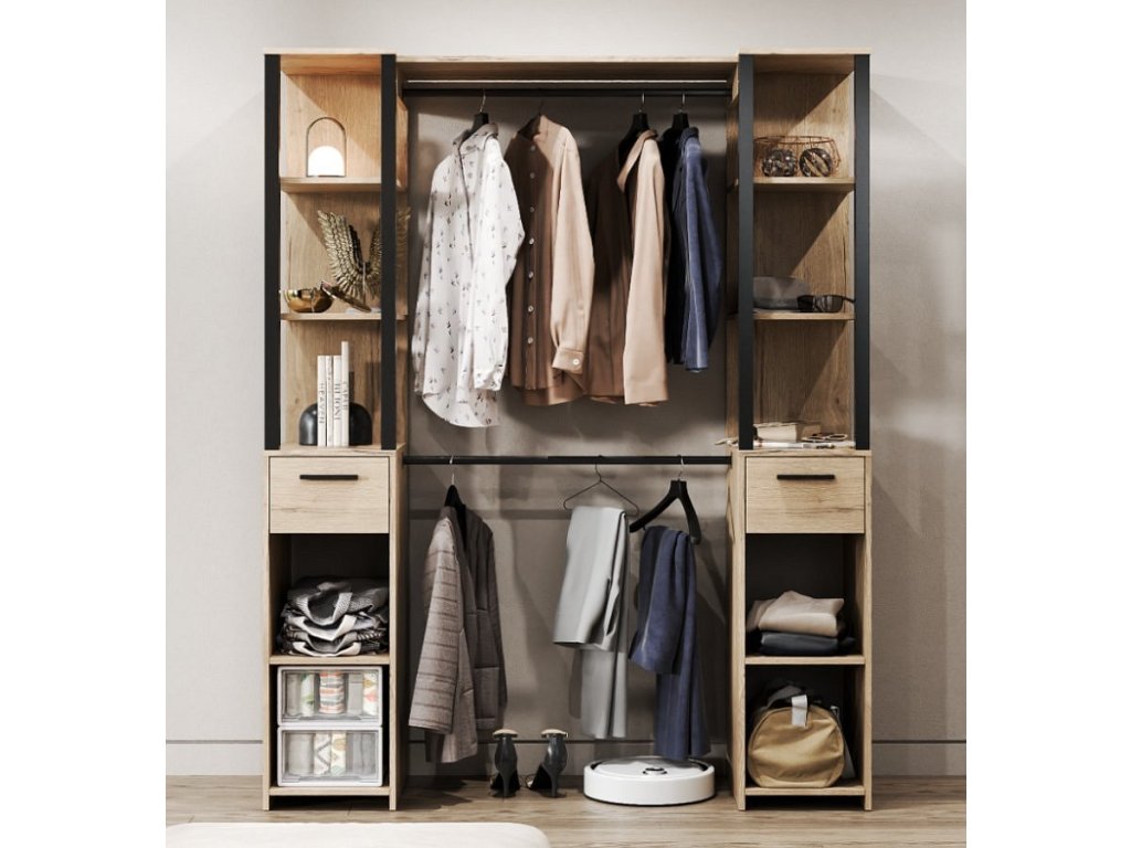 Šatna nabízí dostatek úložného prostoru díky 2 prostorným zásuvkám, otevřeným policím a 2 šatním tyčím, které umožňují přehledné uspořádání oblečení, kabátů či doplňků. Jeho otevřená konstrukce usnadňuje přístup a dodává interiéru vzdušný, elegantní vzhled.