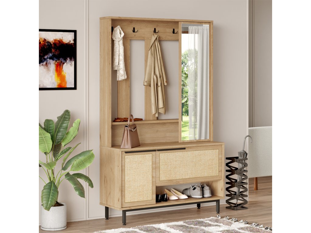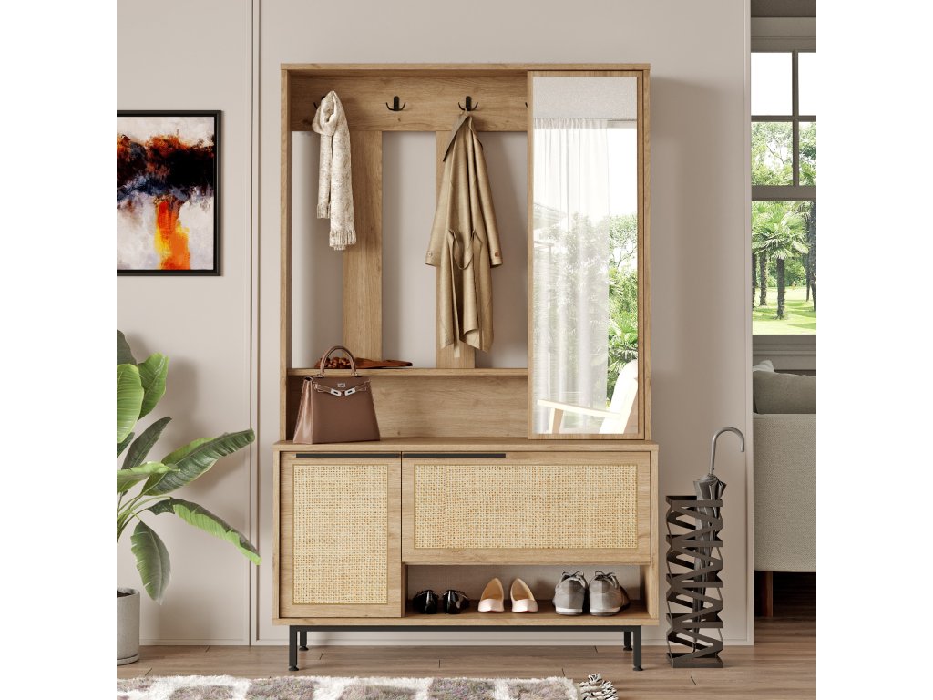 spojuje funkčnost a moderní estetiku. Věšáková stěna poskytuje prostor pro zavěšení kabátů a tašek, zatímco zrcadlo přidává do předsíně více světla a opticky zvětšuje prostor. Botník zajišťuje organizovaný a přehledný úložný prostor pro vaši obuv. Díky svému elegantnímu provedení se sestava hodí do každé moderní domácnosti.