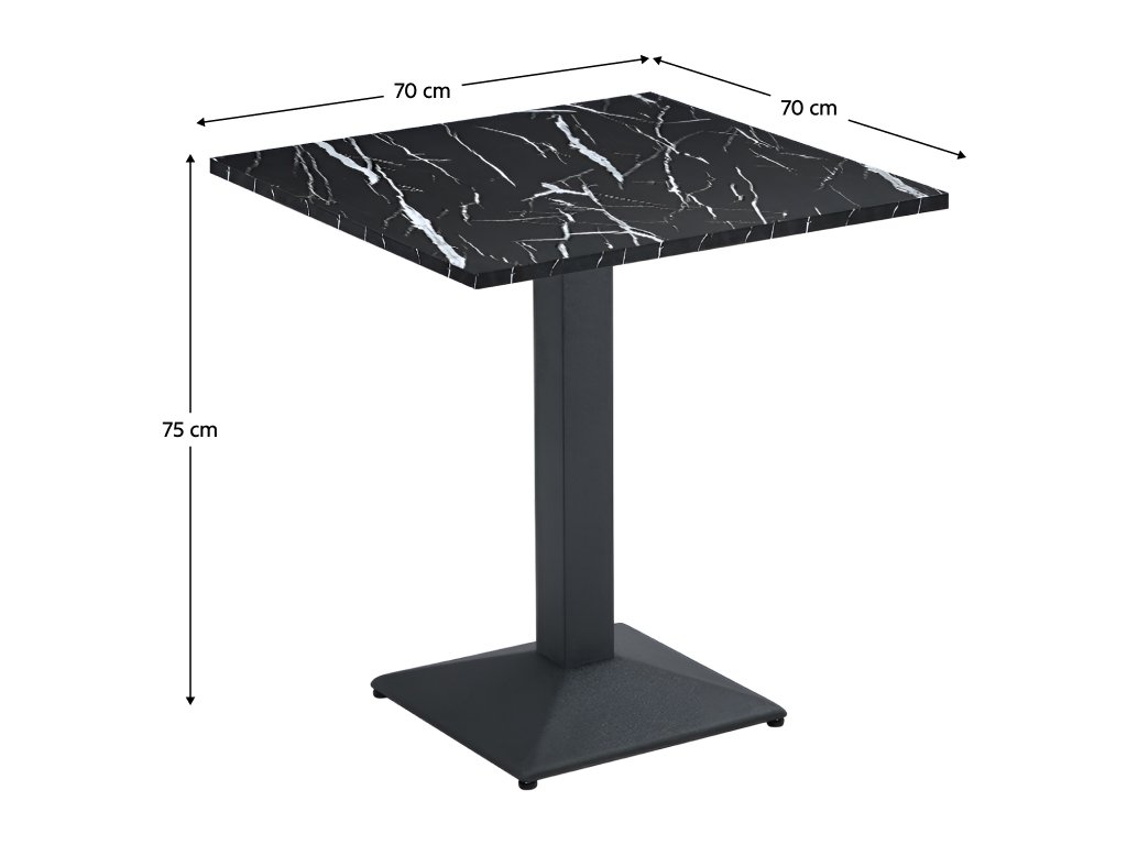 Materiál: DTD laminovaná/kov Barva: vzor černý mramor/černá Rozměry (ŠxHxV): 70x70x75 cm Tloušťka materiálu: 2,3 cm Nosnost: 50 kg Hmotnost: 13 kg Kovová podstava Moderní design Stůl typu: bistro Dodáváno v demontu